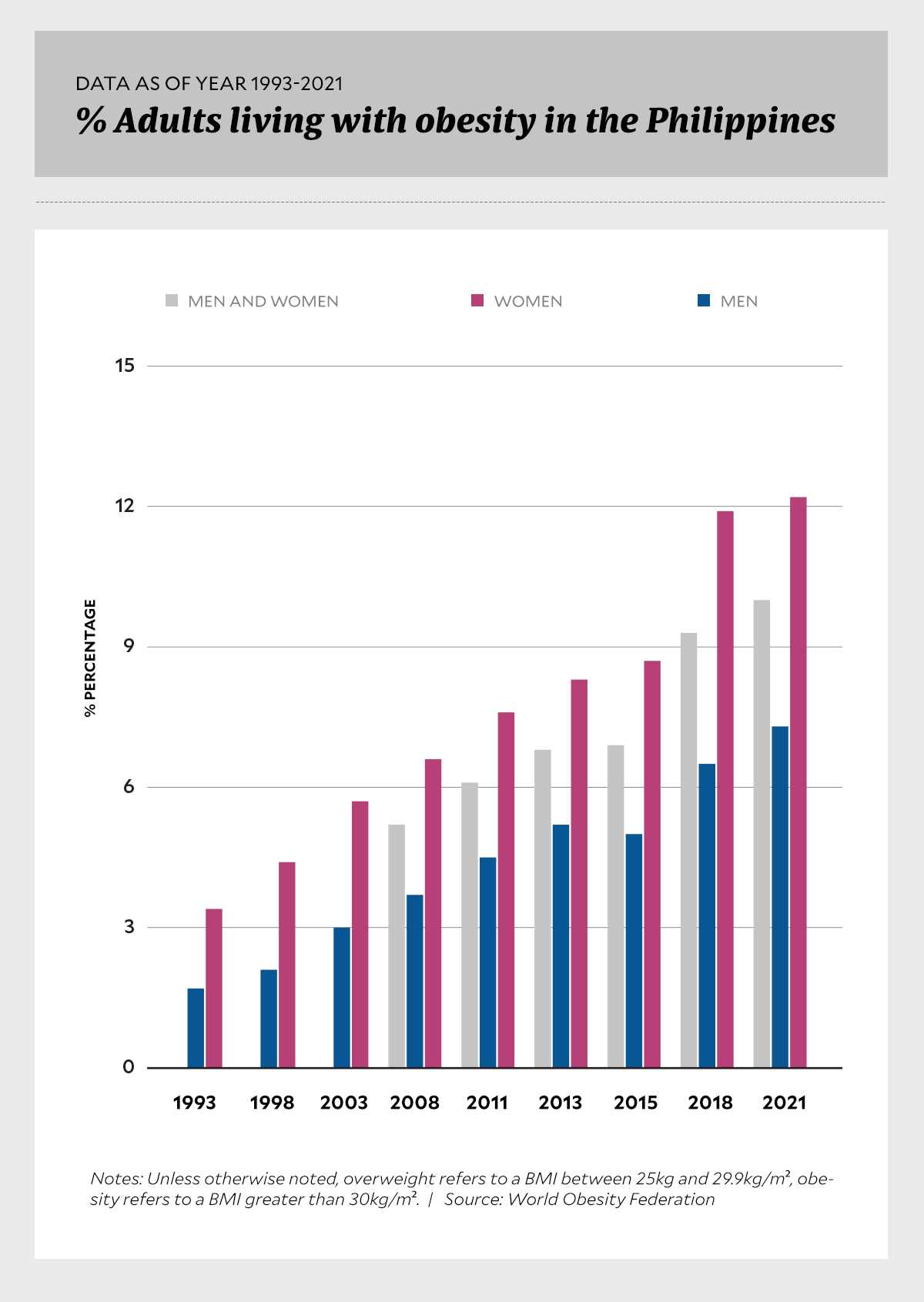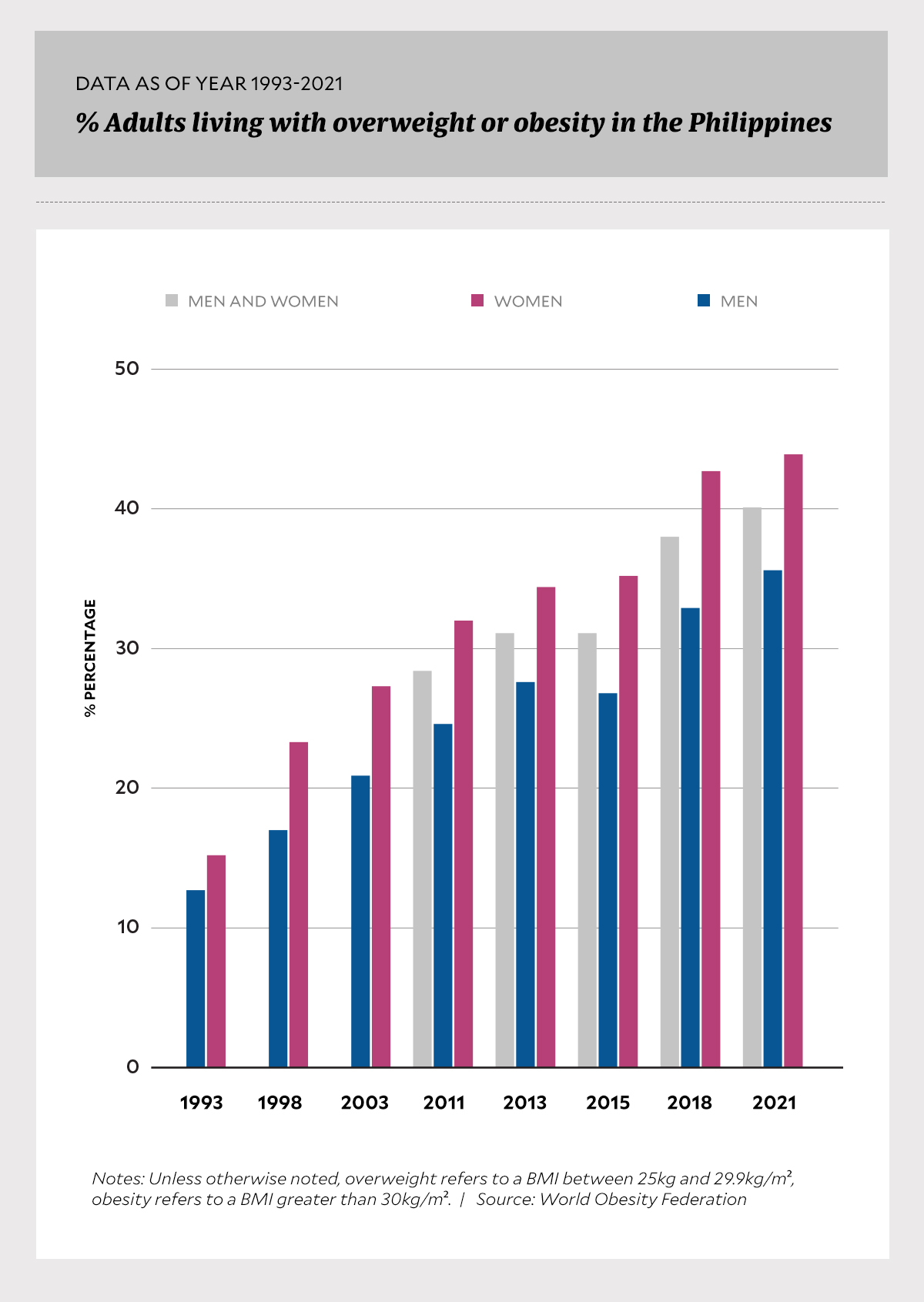 Diese Zahlen stimmen mit den neuesten Schätzungen für 2023–2024 überein, wonach mittlerweile fast 4 von 10 erwachsenen Filipinos betroffen sind. Zwischen 2012 und 2021 stieg die kombinierte Prävalenz von Übergewicht und Adipositas laut aufeinanderfolgenden nationalen Erhebungen von rund 28,4 % auf 40,1 % – ein Anstieg um mehr als 10 Prozentpunkte in weniger als einem Jahrzehnt.
