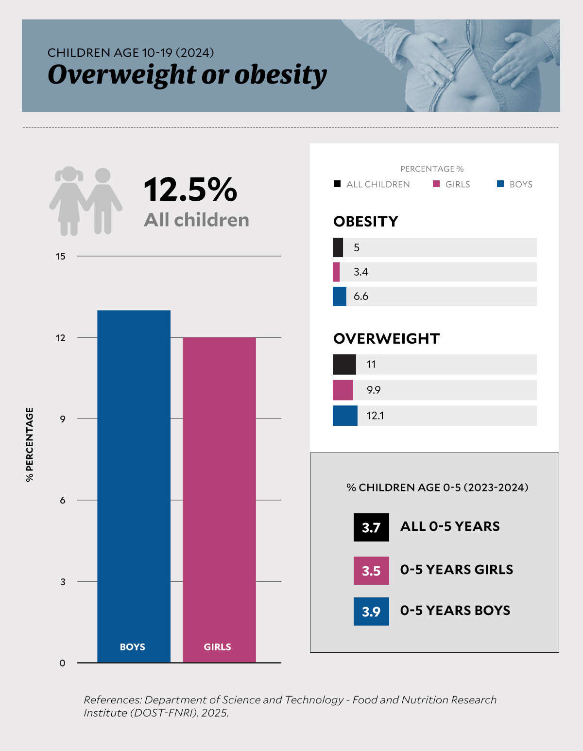 Fettleibigkeit bei Kindern ist für Gesundheitsbehörden zu einem großen Problem geworden. Der Nationale Ernährungsrat (NNC), UNICEF und die Weltgesundheitsorganisation (WHO) warnten kürzlich, dass immer mehr junge Menschen auf den Philippinen davon betroffen sind: 12,9 % der Kinder im schulpflichtigen Alter und 12,5 % der Jugendlichen sind mittlerweile übergewichtig oder fettleibig.