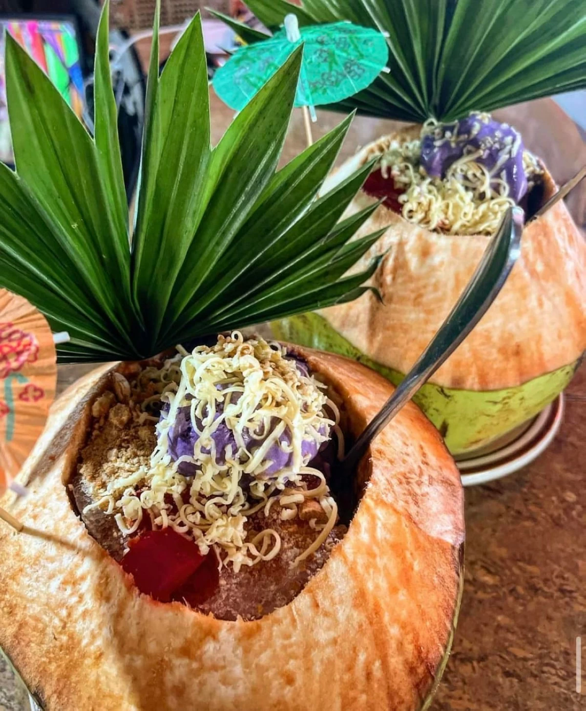 Das Buko Halo-Halo von Halo-Halo de Iloko, serviert in einer frischen Kokosnussschale, ist eine erfrischende Variante des klassischen philippinischen Desserts.