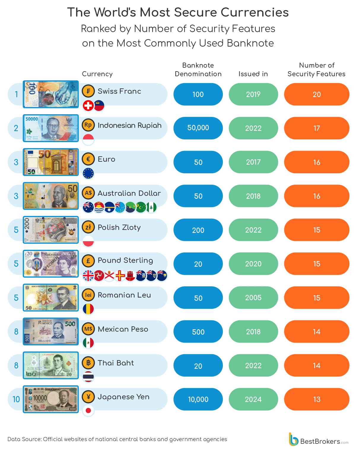Die Bestbrokers-Studie ermittelte auch die sichersten Währungen der Welt, indem sie eine Rangliste nach der Anzahl der Sicherheitsmerkmale der am häufigsten verwendeten Banknoten aufstellte. Diese reichen von Hologrammen und versteckten Bildern bis hin zu Mikrodrucken und der Verwendung von farbverändernder Tinte.