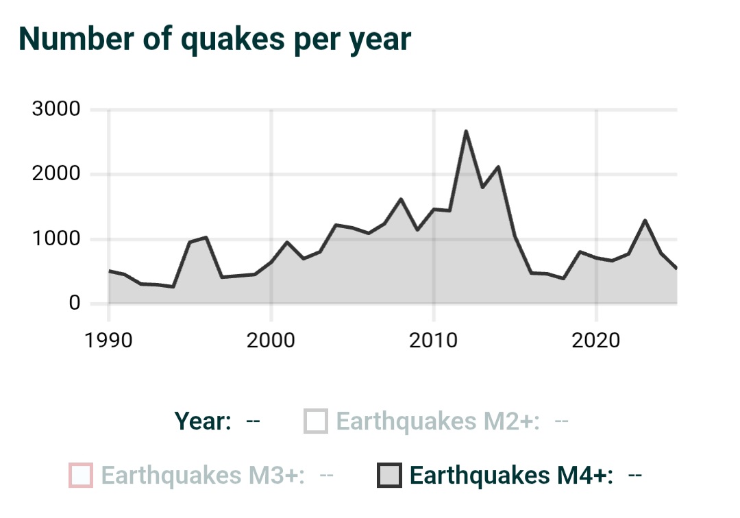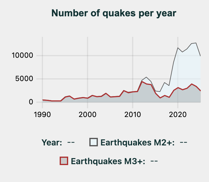 Sehen wir erst mal, dass die leichten Beben massiv zugenommen haben in den letzten 6 Jahren. Es ist also „eine Situation“. Die M3+ sind allerdings nicht auf einem Allzeithoch.