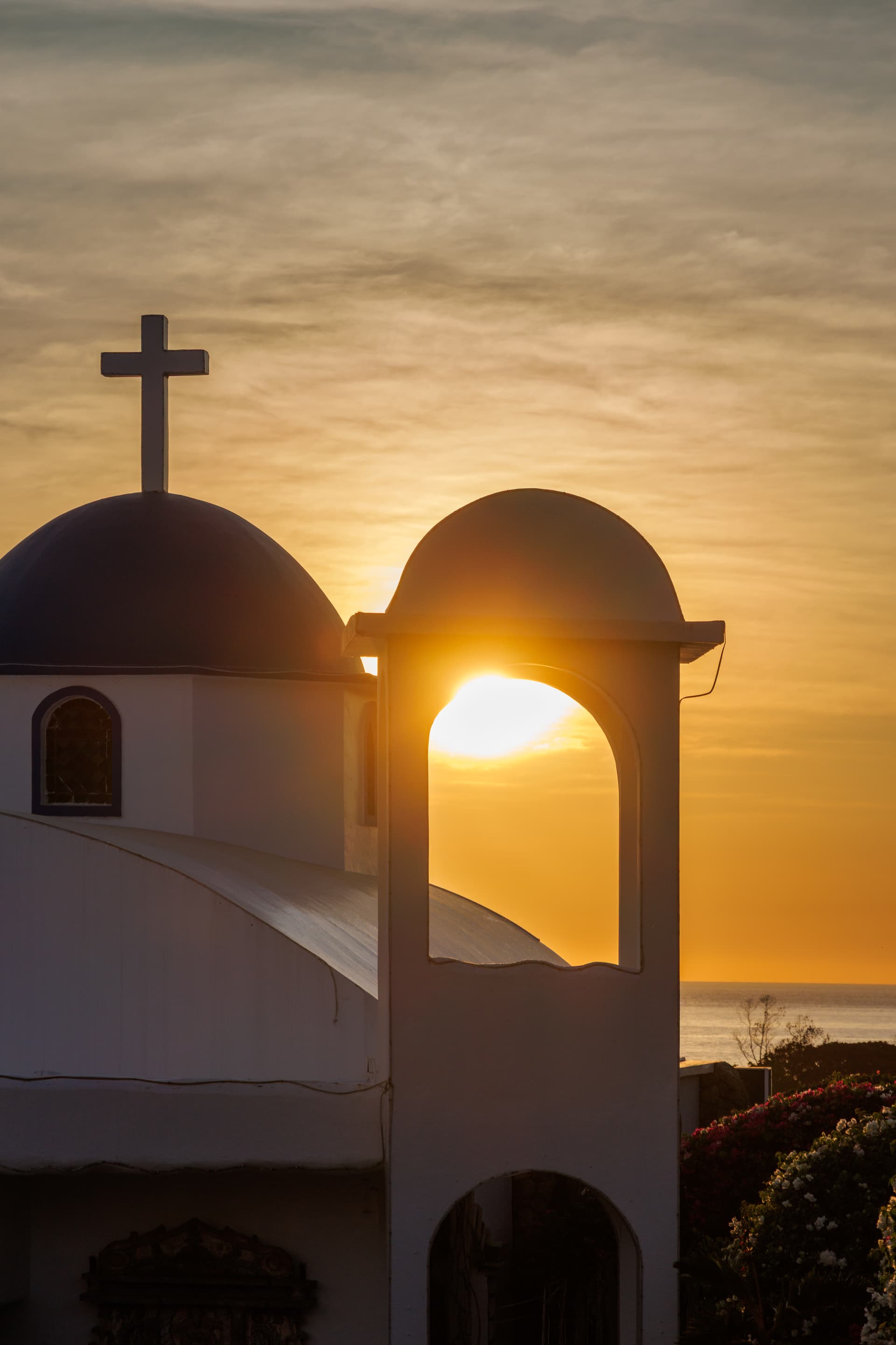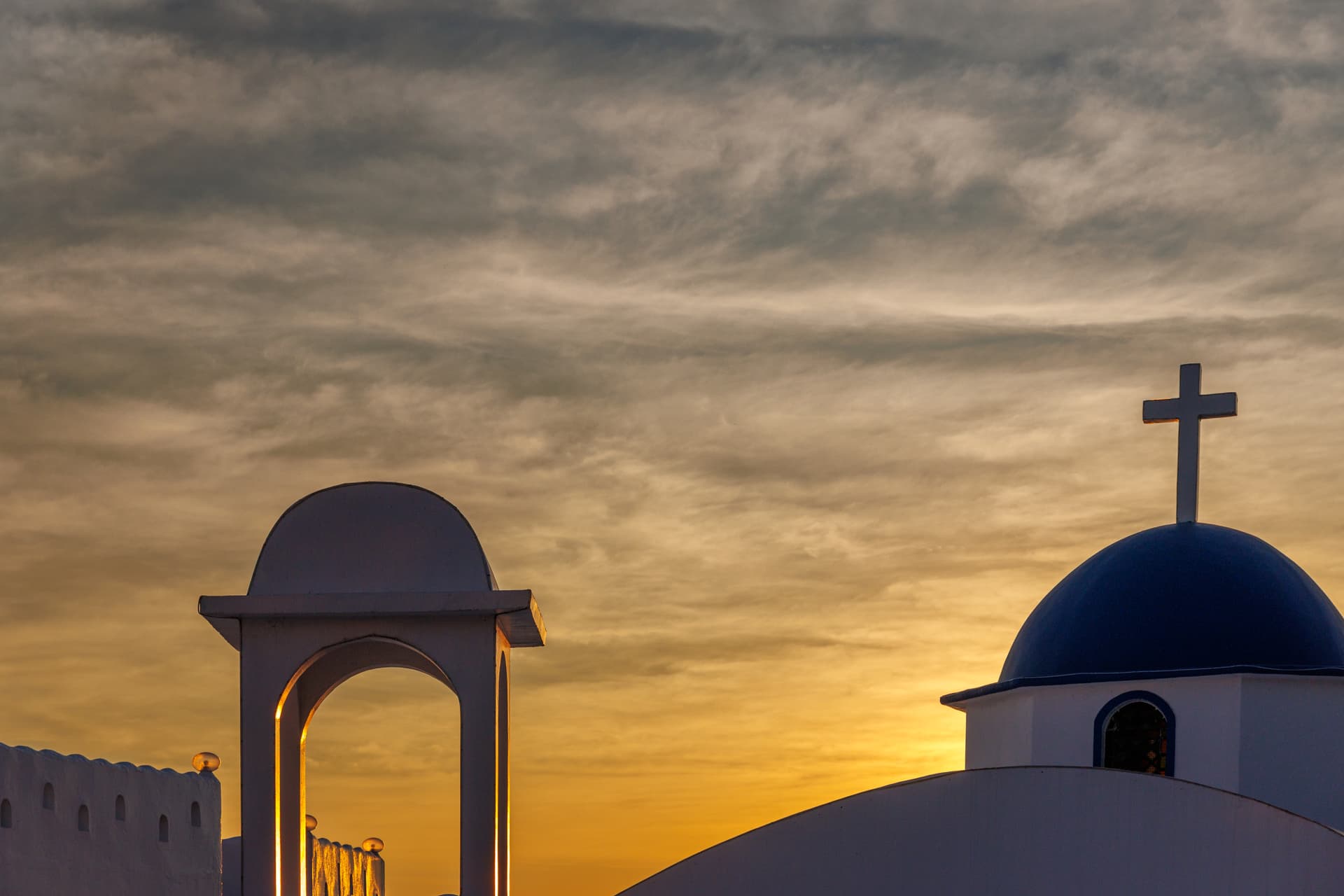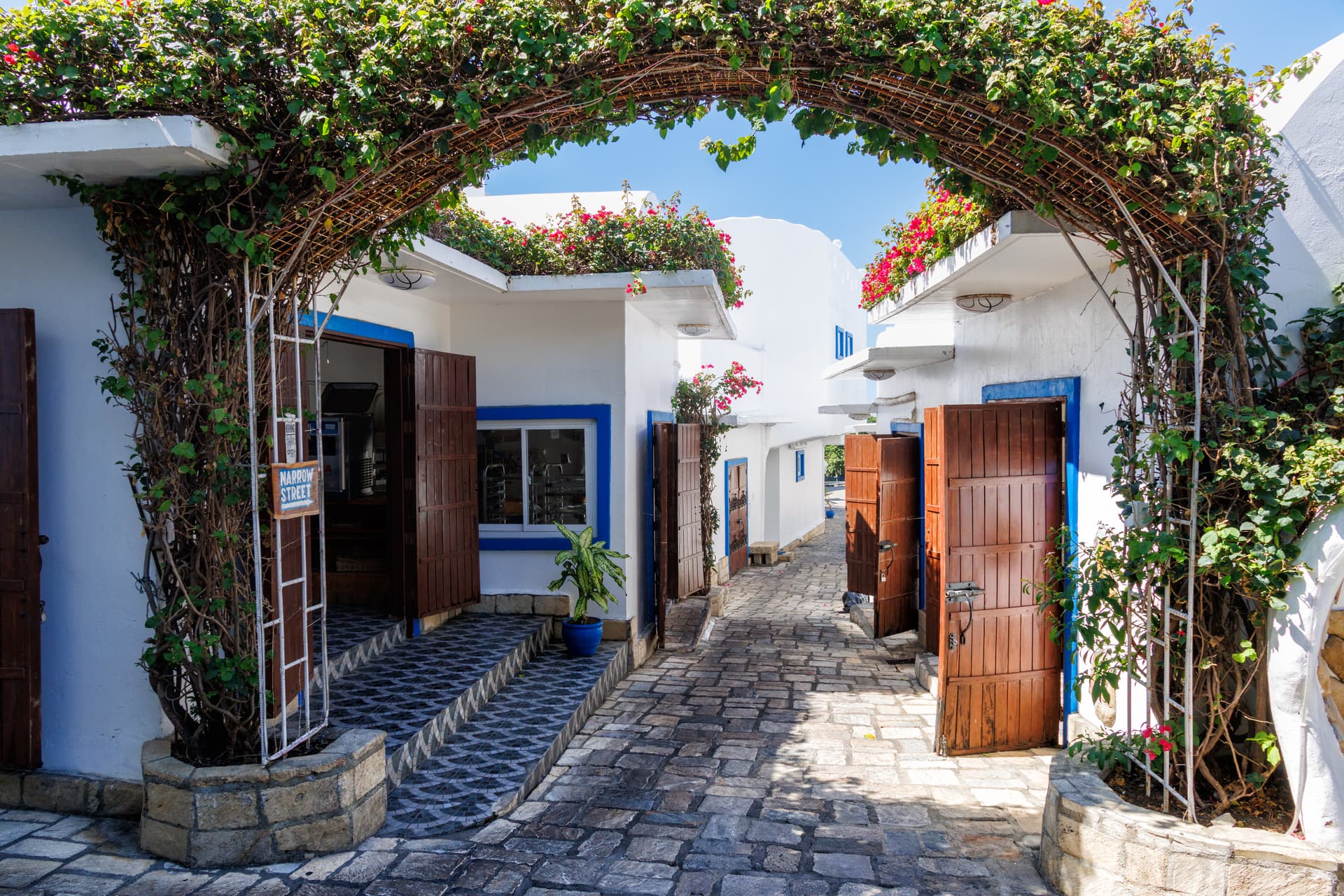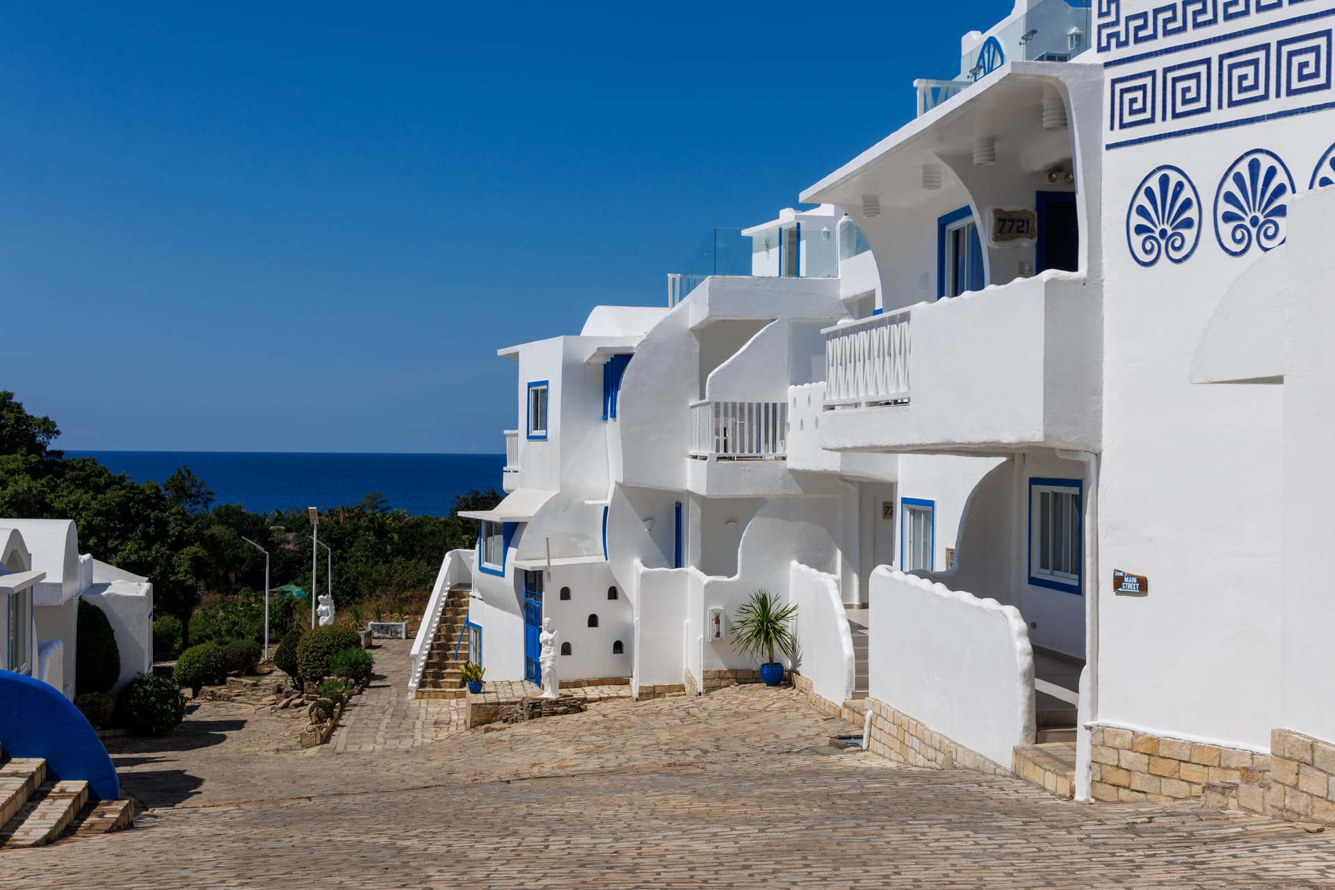 Alles ist in strahlendem Weiß und Blau gehalten, mit den typischen Rundbögen und Kopfsteinpflaster-Wegen, die man aus Griechenland kennt.