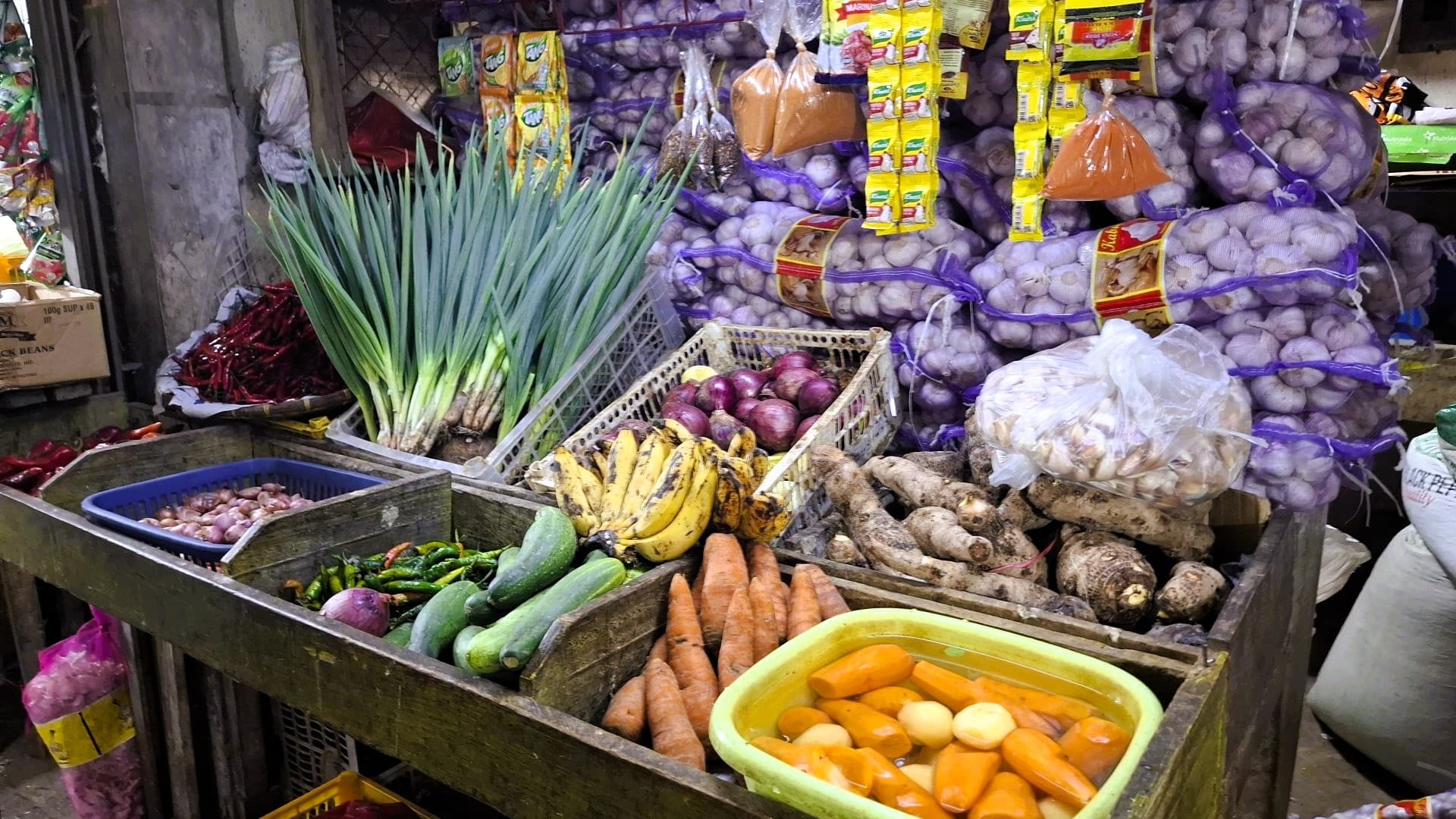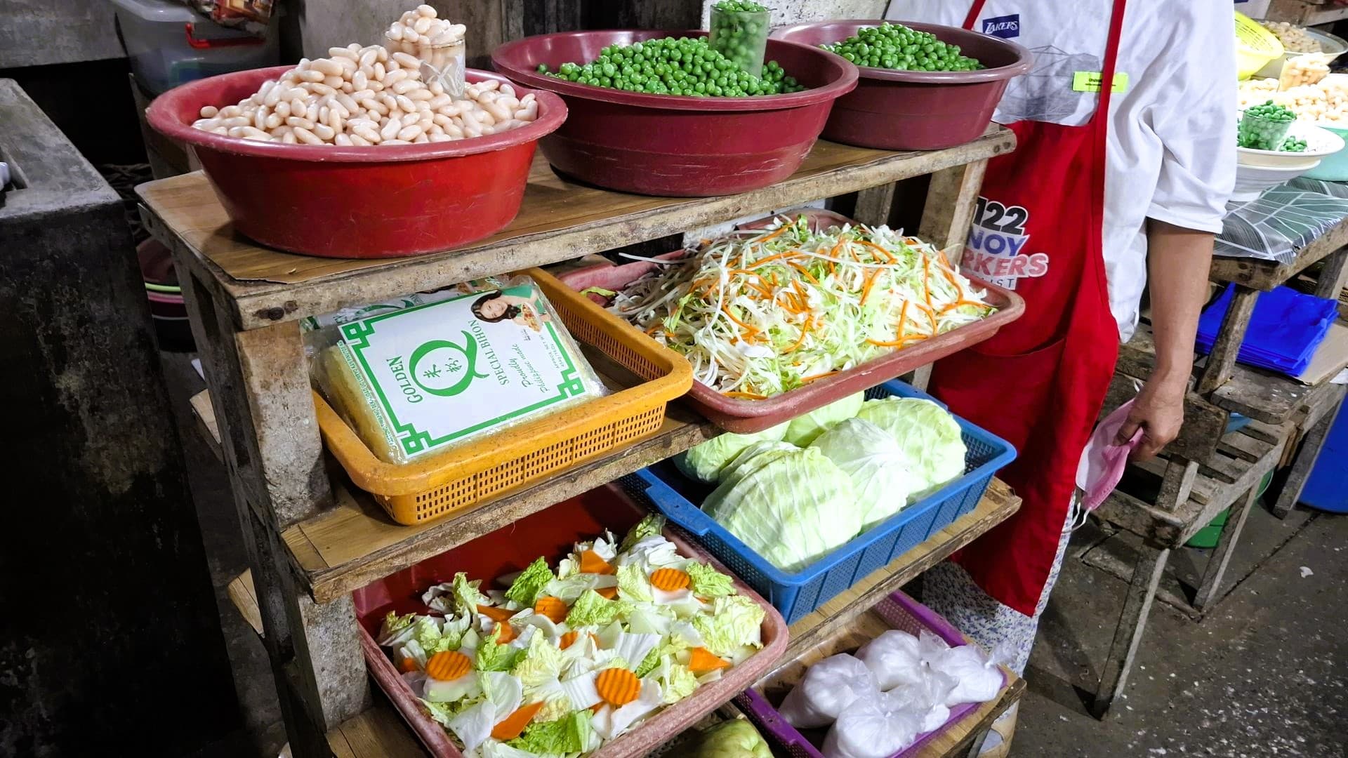 Im Inneren des Marktes zeigt sich dann der eigentliche Alltag: enge Gänge, Kunden, die Gemüse auswählen, und Händler, die gleichzeitig vorbereiten, waschen und verkaufen. Man sieht unter anderem Frauen beim Waschen von Kartoffeln sowie beim Schneiden und Zusammenstellen von fertigen Gemüsemischungen, die später für Gerichte wie Lumpia oder Embotido verwendet werden.