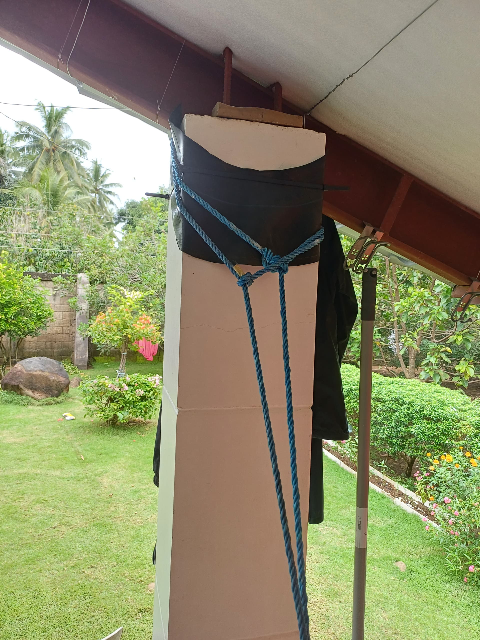 Hier beispielsweise als Säulenschoner alter Gummischlauch aufgeschlitzt.