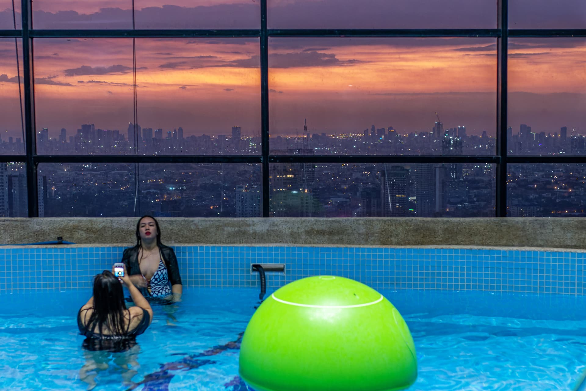 Natürlich war ich auch ins oberste 52 Stockwerk auf Besuch, dort gibt es den Swimmingpool. Zwischen den beiden Türmen ist eine Verbindungsbrücke im 52sten. Man konnte die Kamera durchs offen Fenster schieben und Bilder machen.
