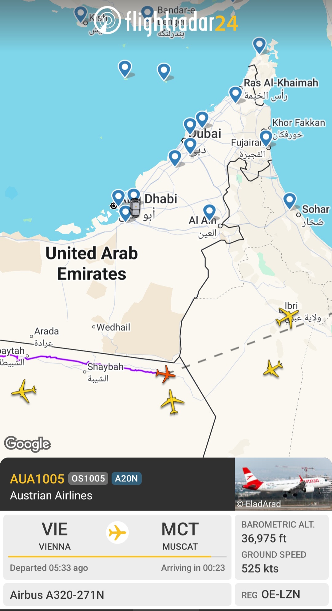 Schau’ mal die Austrian auf dem Weg nach Muskat. Transponder ist gestört. Die wird proppenvoll zurückfliegen, jede Wette.