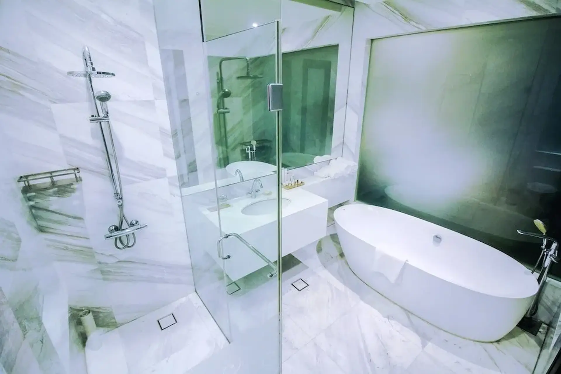 - Innenraum: Der Gebetssaal ist schlicht, aber elegant gestaltet, mit kalligraphischen Verzierungen und sanften Rosatönen, die eine friedliche Atmosphäre schaffen.