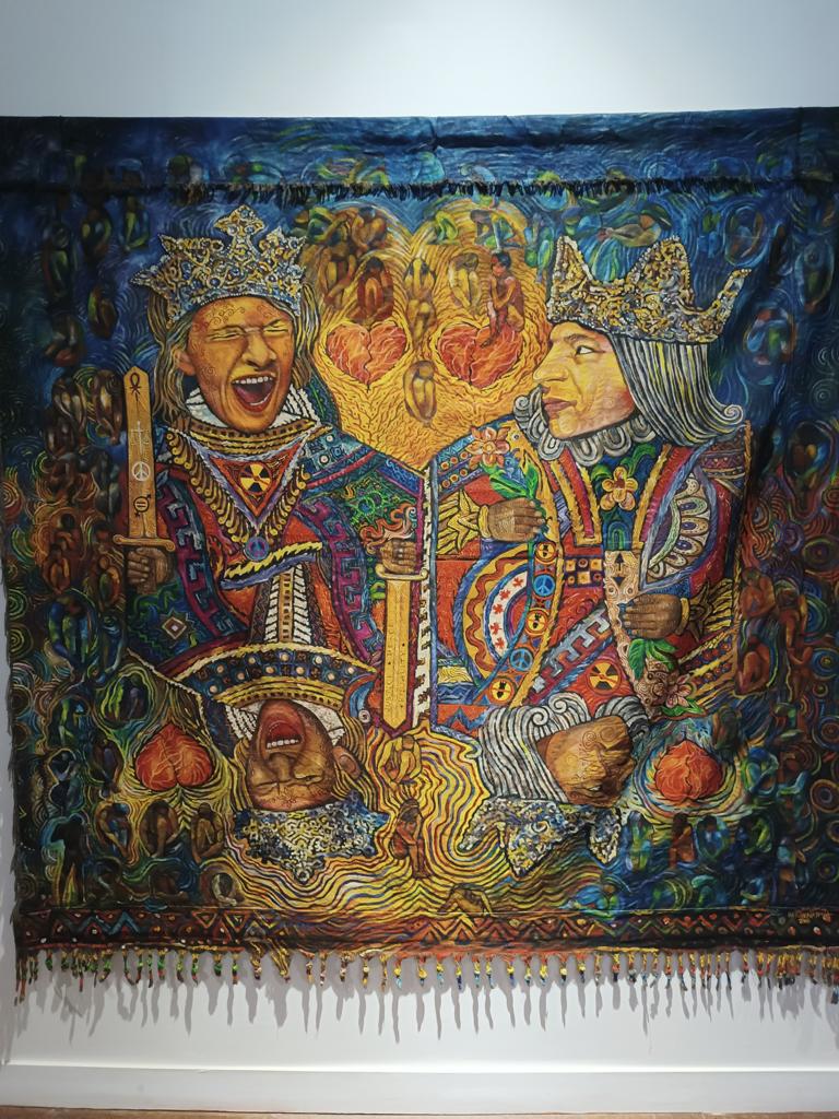 Nicht leidend oder sanft, sondern zornig, kraftvoll und konfrontativ. Um ihn herum befinden sich abstrakte Formen, industrielle Symbole, Fragmente von Maschinen, Zahnräder und expressive Farben. Christus erscheint nicht losgelöst von der Welt, sondern mitten in einer industriellen Umgebung.