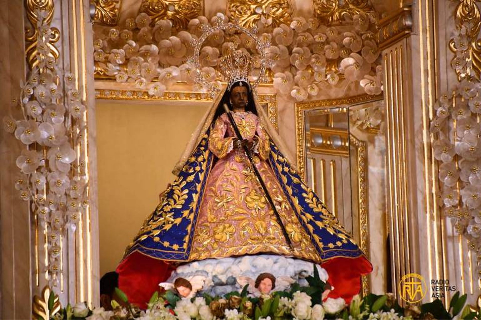 Das Innere ist schlicht, aber eindrucksvoll. Besonders auffällig ist der zentrale Altarbereich mit der dunklen Marienstatue, die in einem gläsernen Schrein aufbewahrt wird. Gläubige stehen oft lange an, um sich ihr zu nähern, Kerzen zu entzünden oder persönliche Gebete zu sprechen.