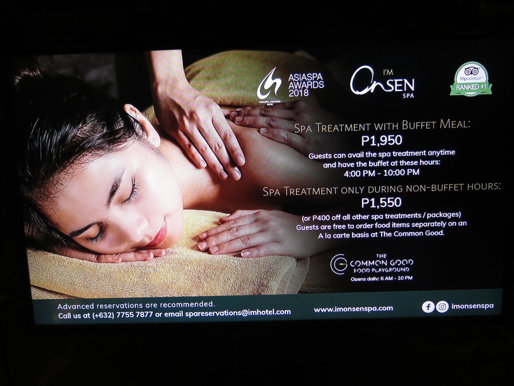 War jahrelang mein absolutes Lieblingshotel in Manila /Makati . Nicht wegen der Nähe zur Burgos street aber wegen seinem Japanischen Onsen ( Badehaus ) mit Sauna und schönem Pool in dem man quasi über dem Bürgersteig der Makati avenue schwimmt . Leider war das Wasser dort immer recht kalt weil die Nachbarhäuser absolut keine Sonne rein lassen . Dann war da die Massage auch sehr professionell und relaxing .. Abends dann ans Buffet …Am nächsten Tag zu Fuss in die Power Plant Mall , unterwegs noch beim Thai was essen und nachmittags wieder ins Onsen .