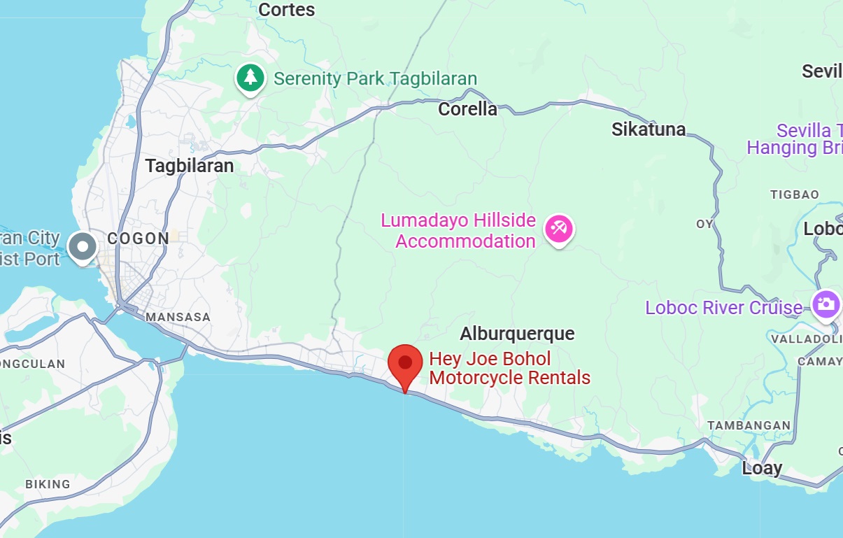 ich habe viermal bei Mikes Motorbike Rental in Baclayon (nicht weit von Tagbilaran) gemietet. Mike teilte sich das Gelände mit einem weiteren Verleiher (Tim Markstadt). Das Ganze hieß die letzten Jahre „Hey Joe Motorcycles“. Die Moppeds waren immer in sehr gutem Zustand. Dazu musste ich nie eine Kaution oder den Pass hinterlegen (ob das jetzt noch so ist weiß ich allerdings nicht). Zurück gegeben habe ich das Motorrad dann in Cebu. Kostete natürlich extra, weil er einen seiner Mitarbeiter nach Cebu City schicken musste.