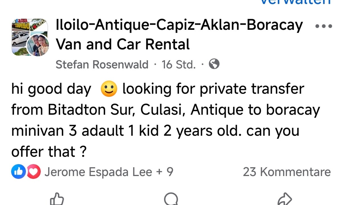 Sonntag müssen wir nach Kalibo dann geht es 5 Tage nach Manila mit ihrem Vater und Onkel. Die 2,5 die wir für das Taxi hierher bezahlt haben scheinen ein super Preis gewesen zu sein, in einer fb Gruppe schwanken die Angebote zw. 3,5 und 6,5…