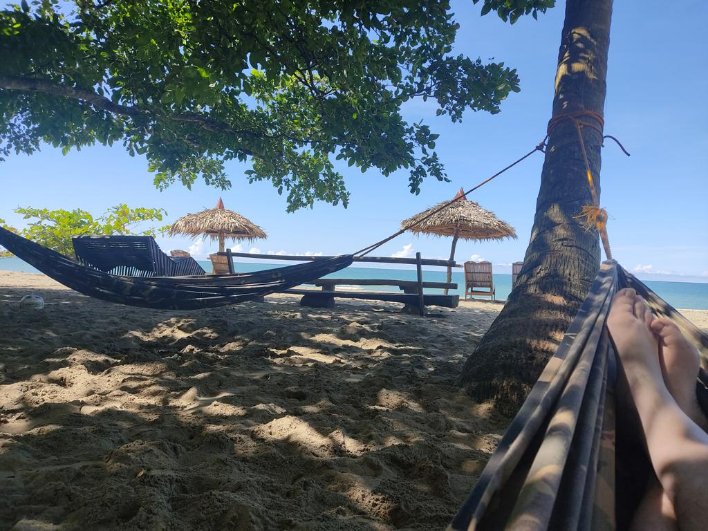 Für mich gibt es kaum einen Ort der besser geeignet wäre, um nach fast 4 Wochen auf Tour etwas Entschleunigung zu genießen, als das „Driftwood Village“. Auch nach den letzten beiden Motorradtouren durch die Inselwelt hatte ich das „Finale“ am Sugar beach verbracht. Mein Kumpel, mit dem ich nach 3 ½ Wochen in Mindanao zum Sugar Beach kam, nannte es „ein kleines Paradies“ und da ist etwas Wahres dran. Ich kenne im ganzen Land keinen Ort der so entspannend wirkt, wie das Driftwood Village. Im Restaurant im ersten Stock zu sitzen und über den üppigen, grünen, tropischen Garten zum Meer zu schauen ist einfach herrlich. Es gibt keine Karaoke-Maschine, man trifft hier das liebenswerteste Personal, das man sich nur vorstellen kann. Es wird hervorragend gekocht. Es hatte sich seit meinem letzten Besuch 2020 nicht viel verändert, einige Hütten mussten nach dem letzten Typhoon neu aufgebaut werden.
