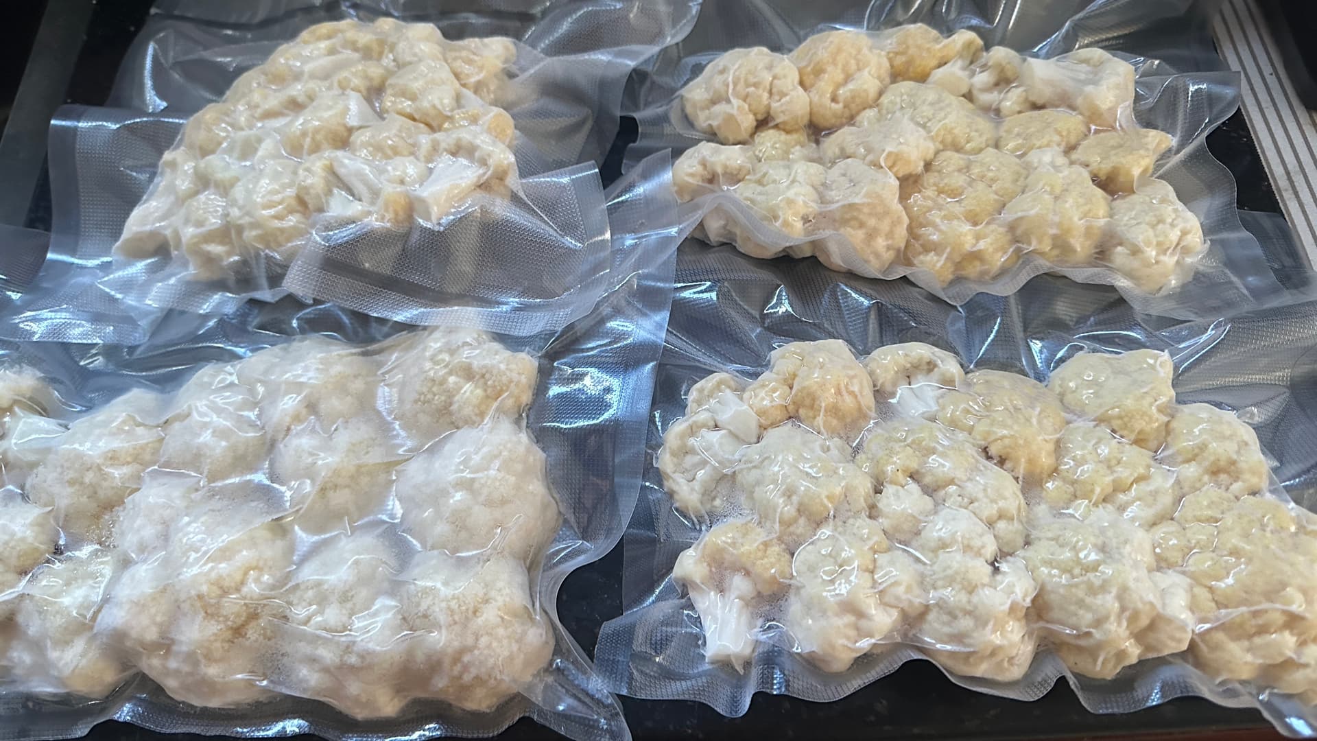 Ich lasse sie dann den überzähligen Kohl in kleine Röschen zerteilen, vakuumiere sie portionsweise und friere sie danach ein…