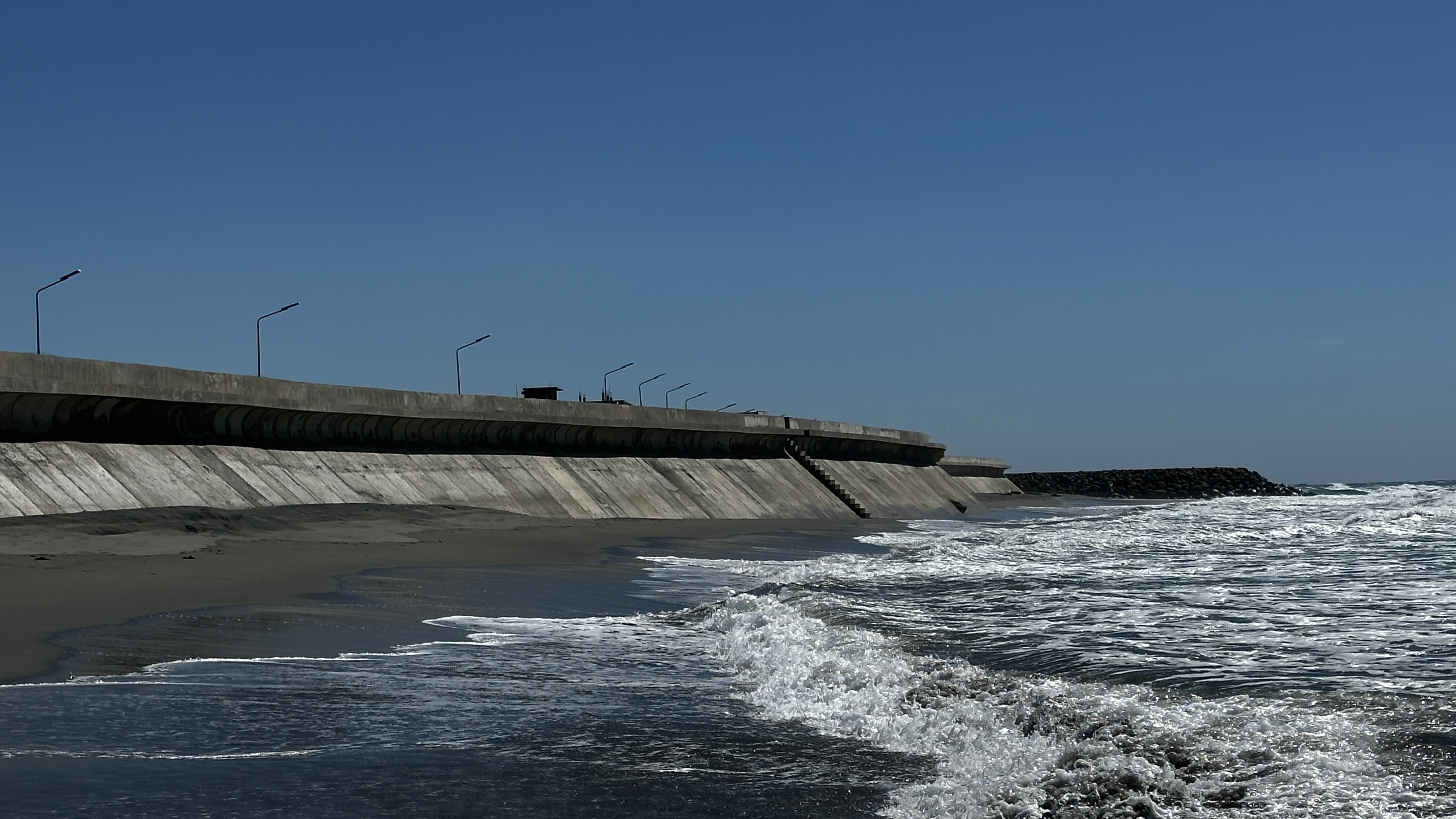 Der Deich ist gut 7 Meter hoch und hat einen Wellenbrecherkopf… Die Buhnen wurden mit riesigen Steinbrocken aufgeschüttet …