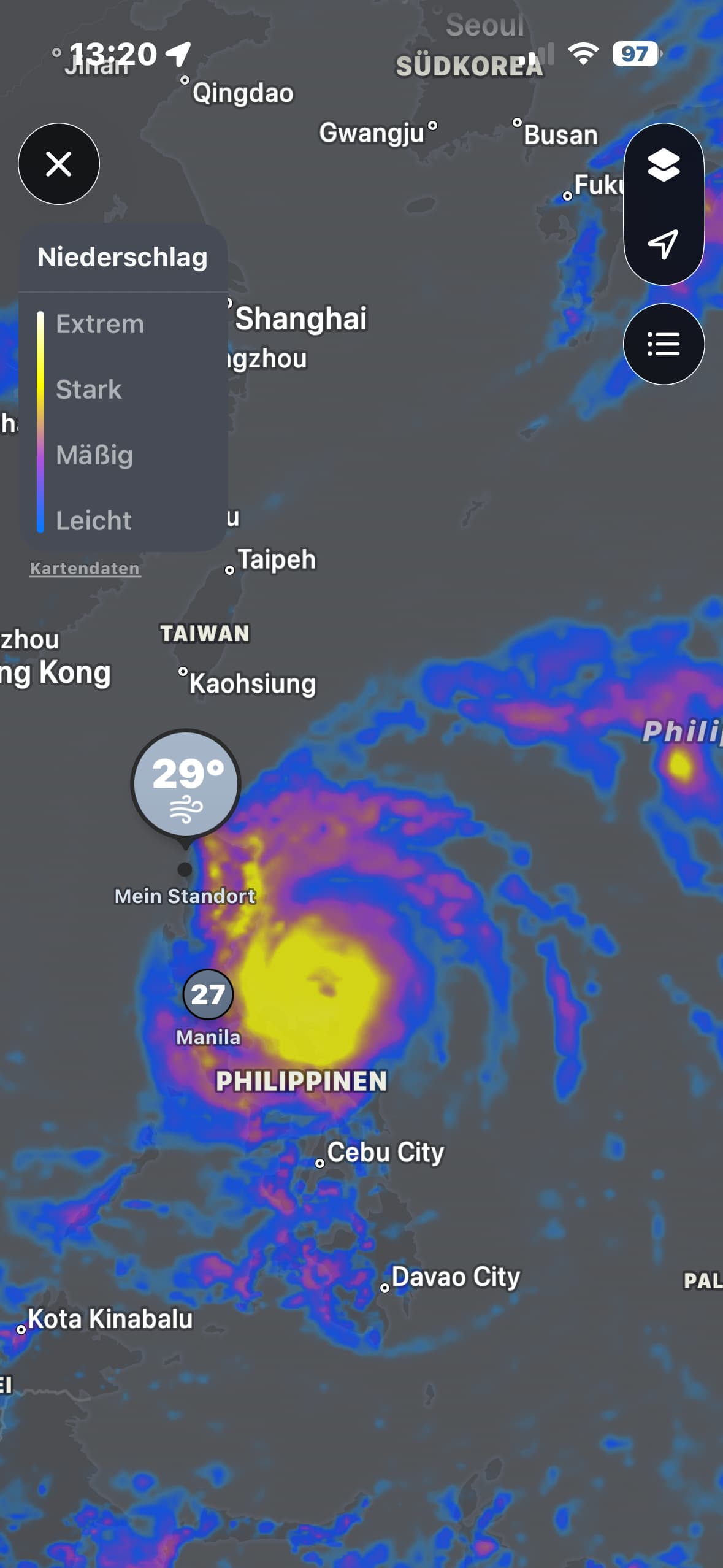 Hier wird es langsam nass und nässer, nichts unnormales. Die Frau war ein bisschen genervt, Walang Pasok und jeder macht sich verrückt und was ist da eigentlich los - „es ist doch nix“. Ich hab ihr die Radarkarte der PAGASA gezeigt, und da sieht man wie gross das System ist – fast genau so gross wie die Philippinen. Und dass wir gerade erst den Rand abbekommen.