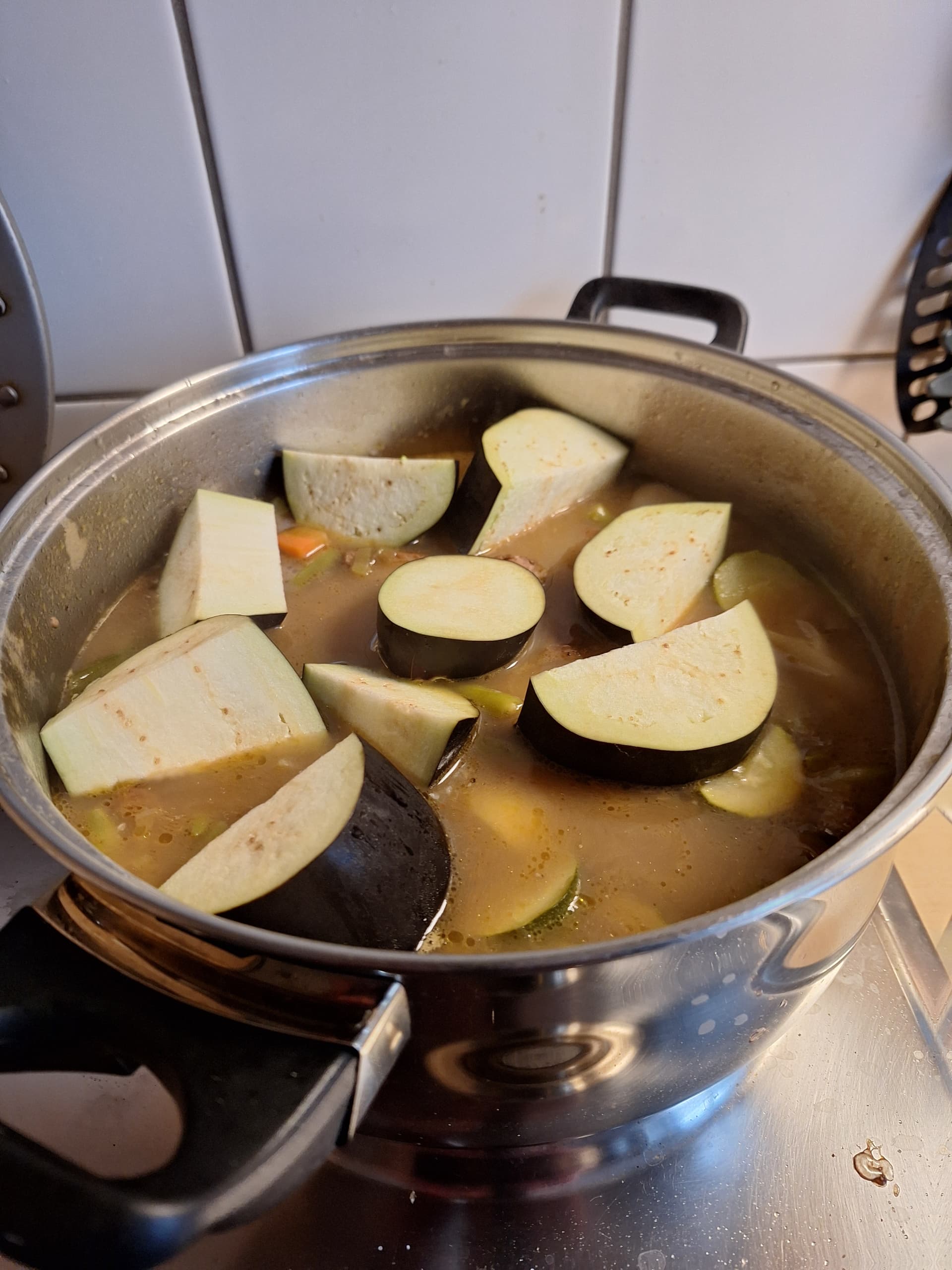 Mit Tamarinden-Gewürzmischung nachgewürzt und Zucchiniwürfel, Lauchzwiebeln und etwas später noch Aubergine in groben Stücken dazu.