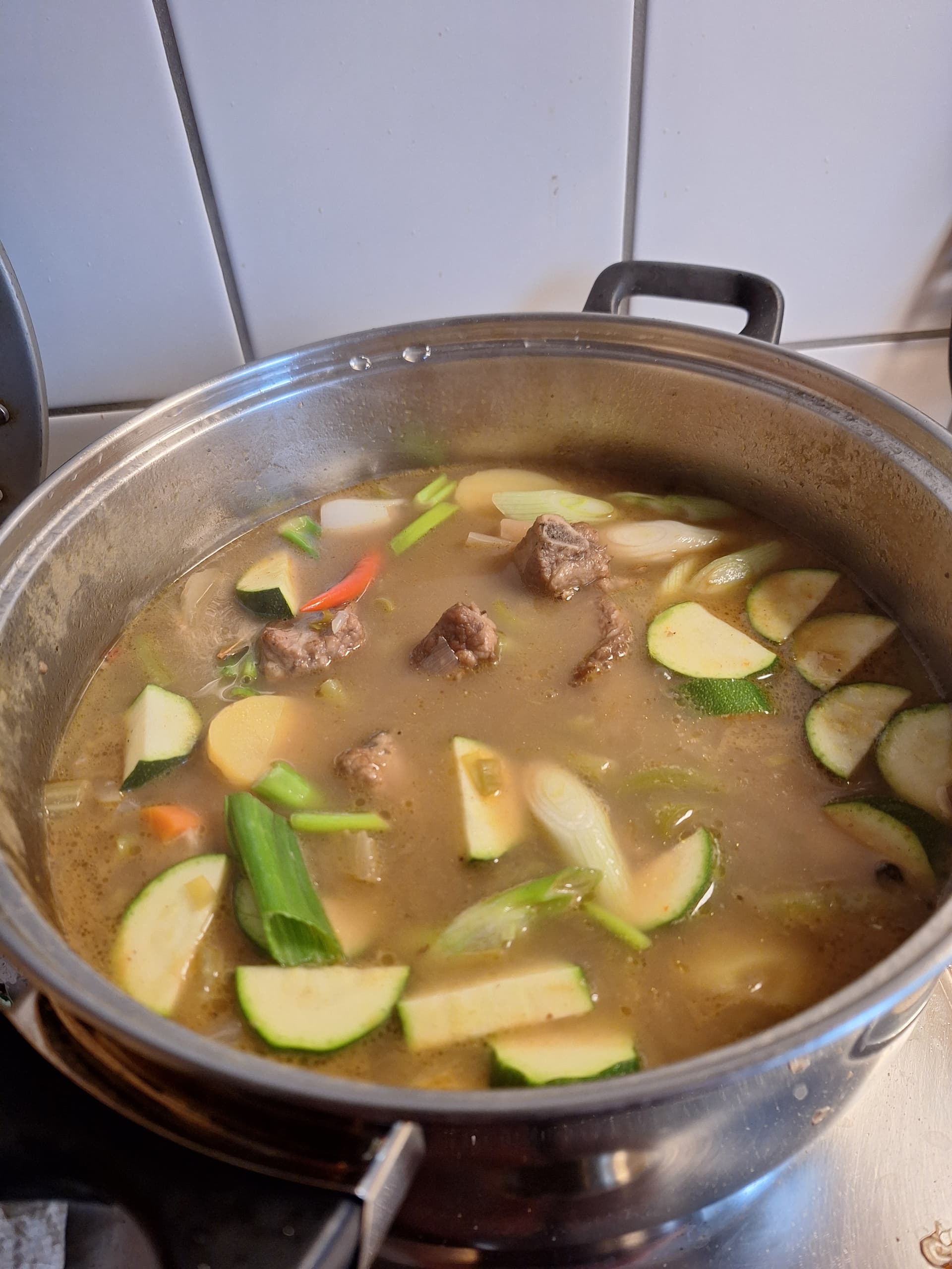 Dann eine Stange geschnippelten Staudensellerie, ein paar geschnippelte Kartoffeln(hier ausnahmsweise als Sättigungsbeilage für mich - meine Frau bekam Reis), etwas Lauch, zwei größere grüne(mildere) und drei kleine rote (scharfe) Chili dazu und 10Min.weiterköcheln lassen.