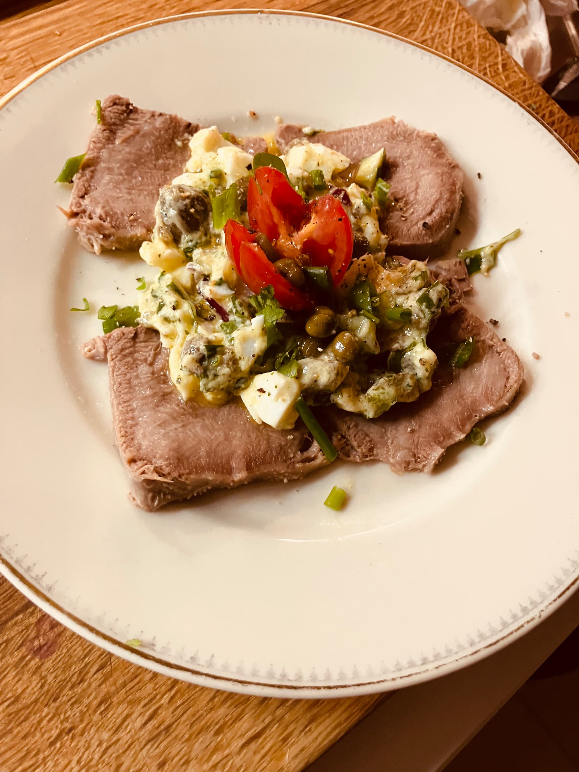 Heute mal französisch-phil Küche... Kalbszunge mit Sauce Gribiche, eine kalte, französische Sauce auf Basis von hartgekochtem Eigelb, Senf , Essig und Öl garniert mit Kapern.. ![]()