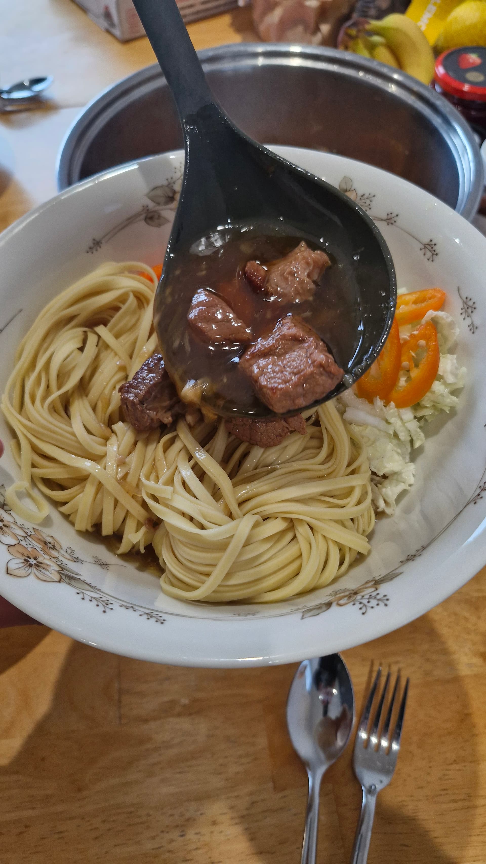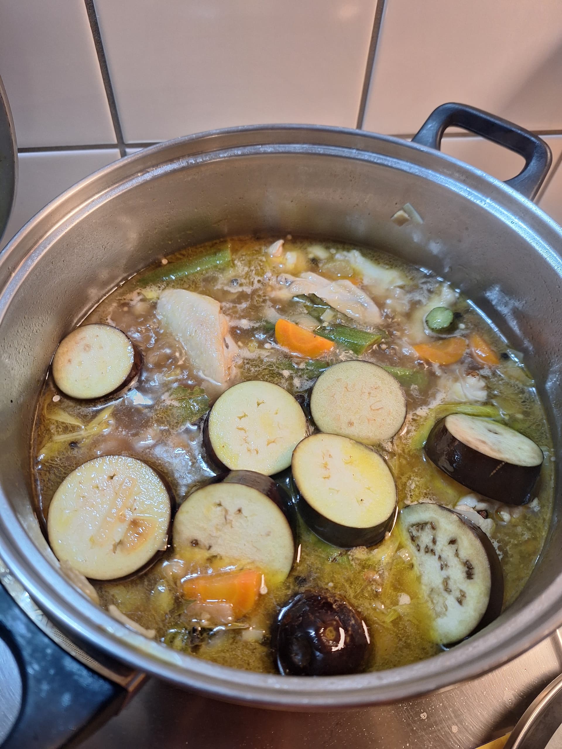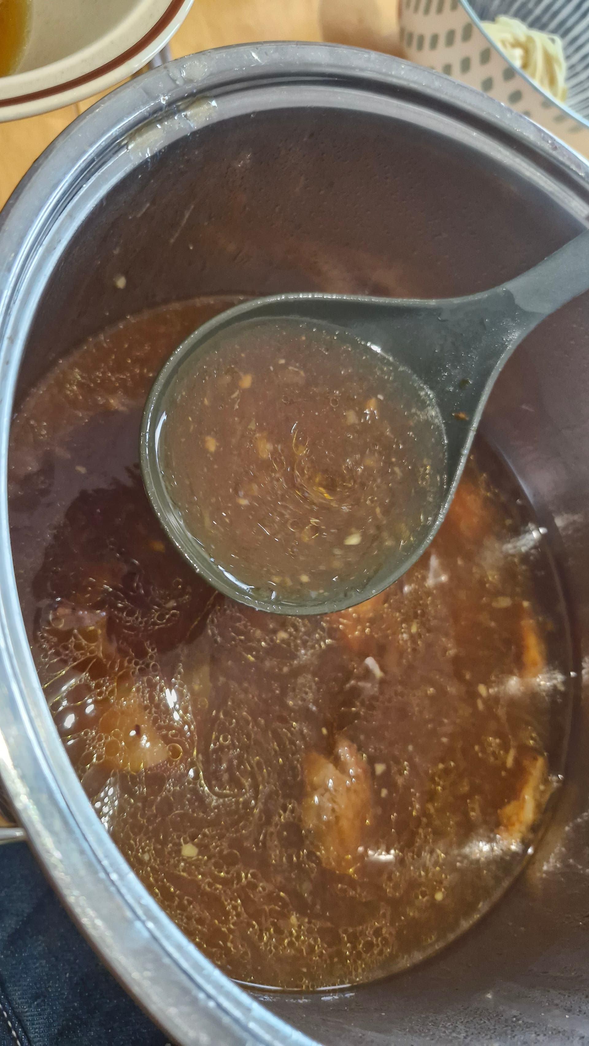 - Kochsud mit Rinderfond, Lorbeerblätter, Pimentkörner etc.