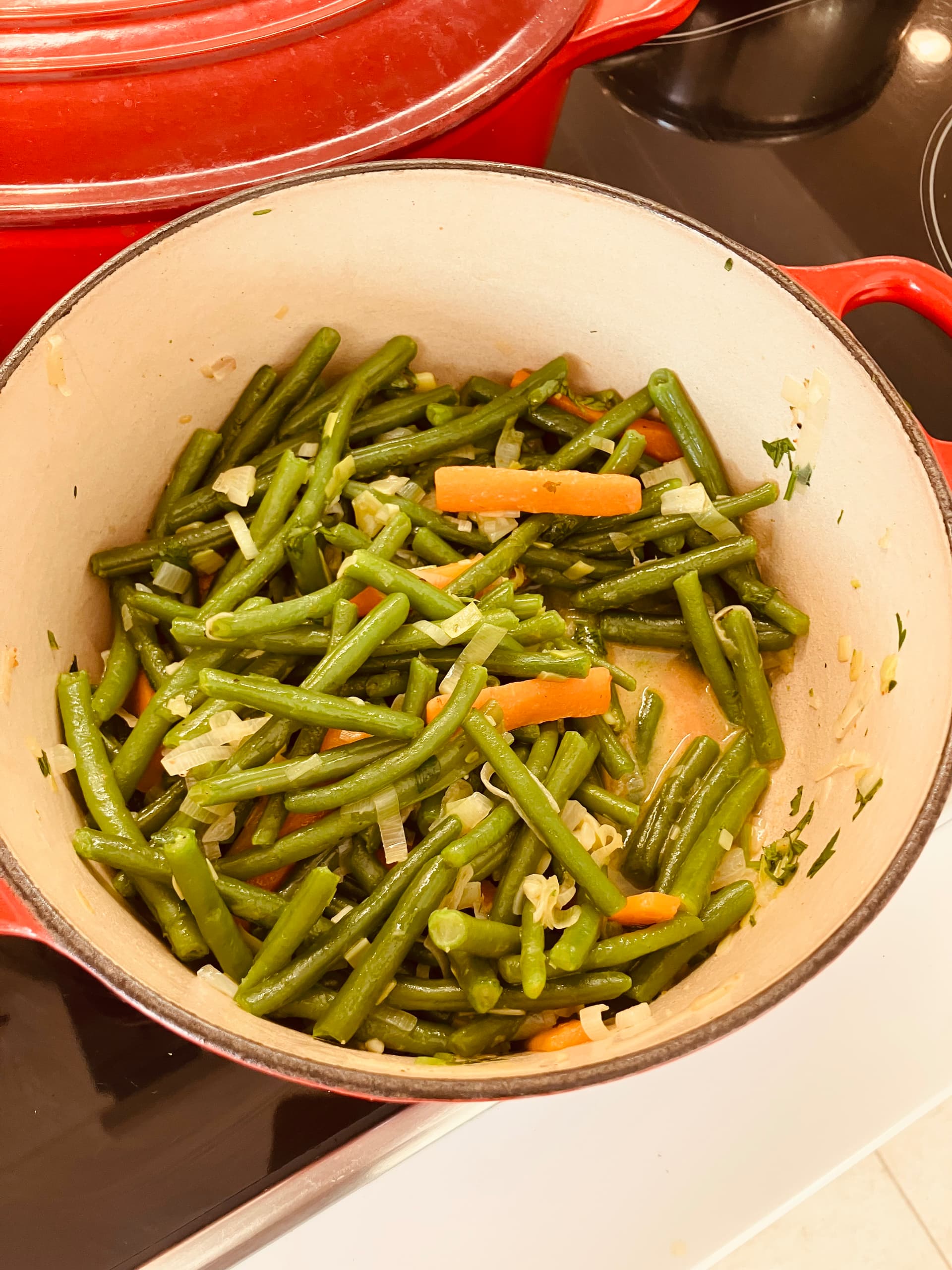 - Als Beilage: grüne Buschbohnen mit Karotten und Schalotten gedünstet sowie extra langkörniger Basmatireis