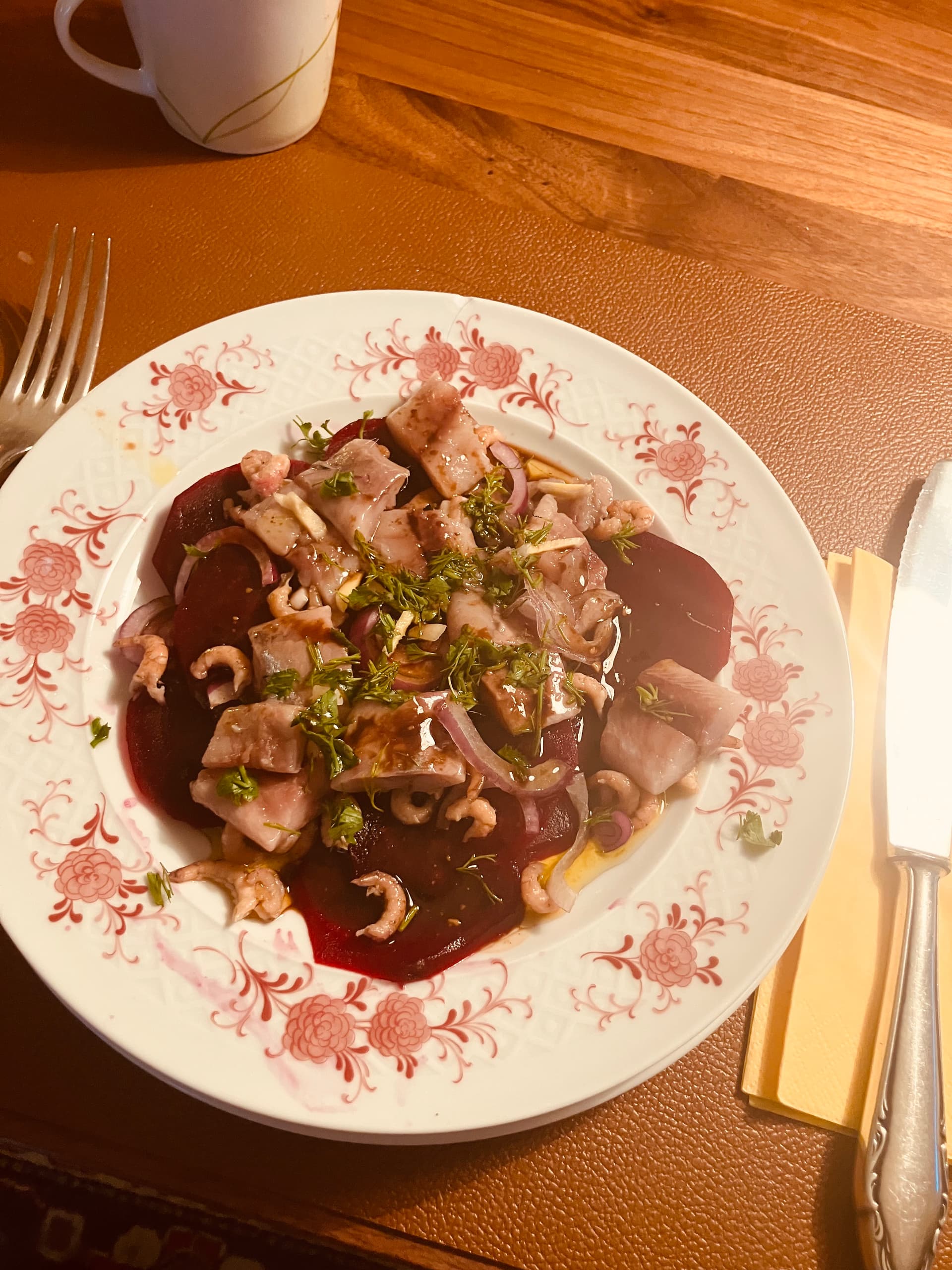 Es muss nicht immer Fleisch sein… heute Matjes-Hering garniert mit Nordseekrabben auf frisch gekochter Roter Beete (besser nicht die fertig gekochte kaufen) mit frischen Kräutern und Zwiebeln und dazu eine leckere Vinaigrette (Olivenöl-Balsamico-Basis).