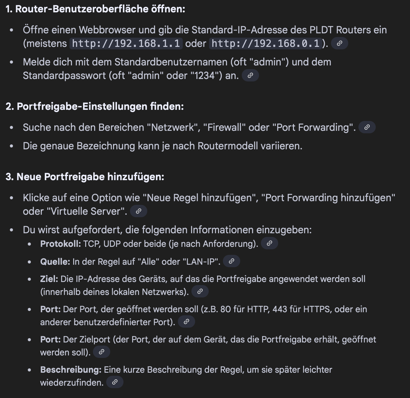 Allerdings benutzt PLDT CGNAT (Carrier Grade NAT), das heisst, dass hinter Deiner IP-Adresse mehrere Haushalte sitzen. Du sitzt quasi in einem lokalen Netzwerk von PLDT, das nach aussen über eine IP angebunden ist, die erst mal zu Deinem Router geschickt werden muss bevor Du Portforwarding machen kannst.
