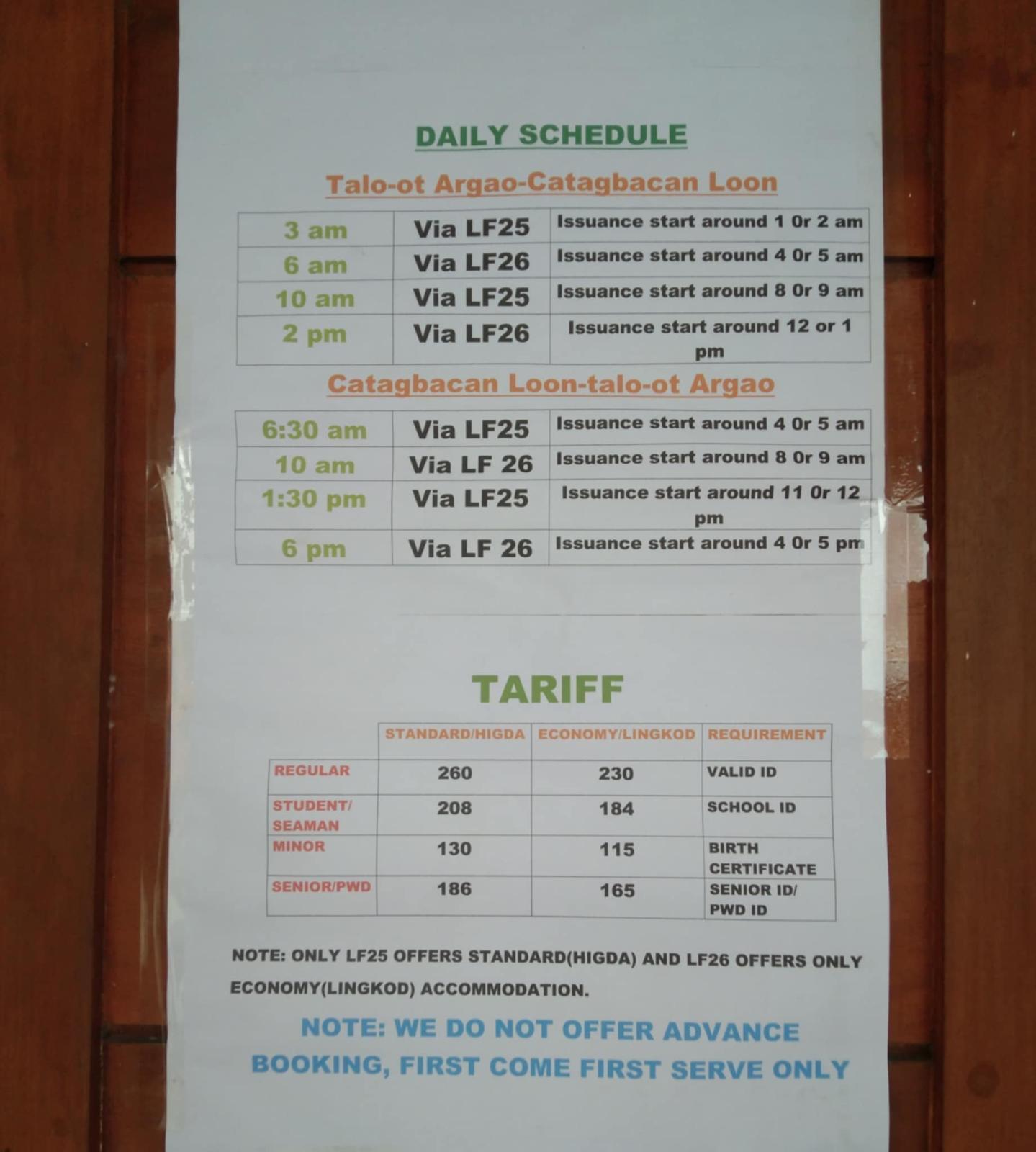 Einen Vorschlag hätte ich noch : Ab Port Taloot bei Argao/Cebu nach Catagbagan / Port Loon auf Bohol ,per Bike hoch nach Ubay . Von dort fahren dann einige RoRO Fähren nach Bato oder du kannst auch kleinere Bancas nehmen die dein Bike auch mitnehmen . Die fahren dann nach Bato oder gar nach Maasin je nachdem wie die Nachfrage bei den Passagieren ist .