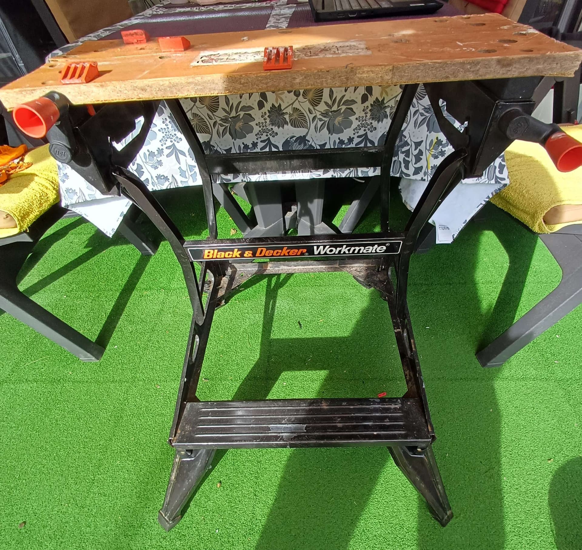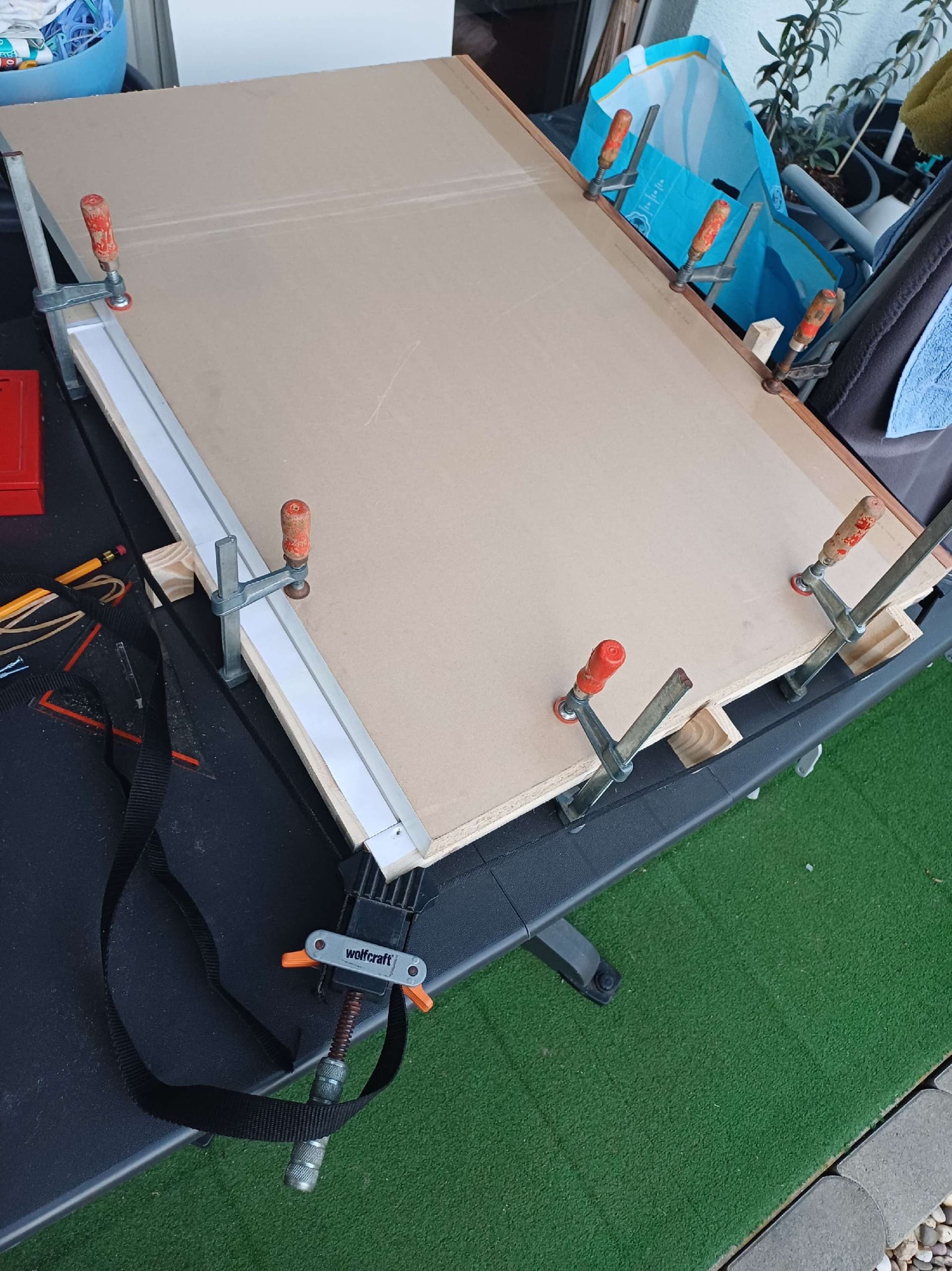 Die Summe der Höhen der vorhandenen Leiter und des Sir Pogi wurde allerdings schnell als unzureichend für die Verrichtung dieser Tätigkeit erkannt. Es musste eine Lösung her. Zum Glück haben Die Jungs gerade die Wand gestrichen, da war ein Gerüst nicht fern.