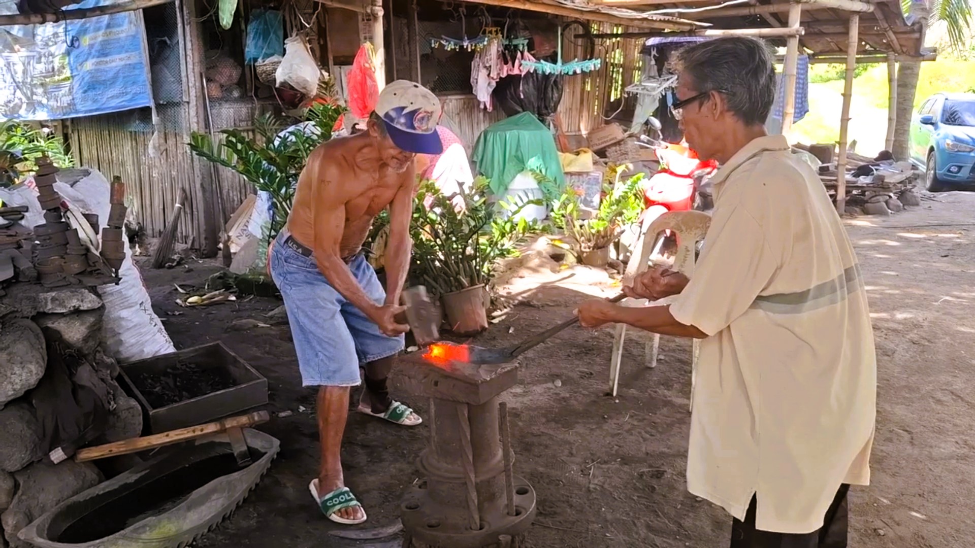 An diesem Tag steht etwas Besonderes an: Ein altes Bolo, eine der wichtigsten Klingenformen auf den Philippinen, soll nicht einfach entsorgt werden. Stattdessen wird es in Temmos Schmiede ein zweites Leben erhalten. Die alte, abgenutzte Klinge wird erhitzt, geformt, gehämmert – Schritt für Schritt entsteht aus dem ursprünglichen Werkzeug etwas Neues. Es ist kein industrieller Prozess, sondern Handarbeit im wahrsten Sinne des Wortes. Jeder Schlag sitzt, jede Bewegung ist das Ergebnis jahrelanger Erfahrung.