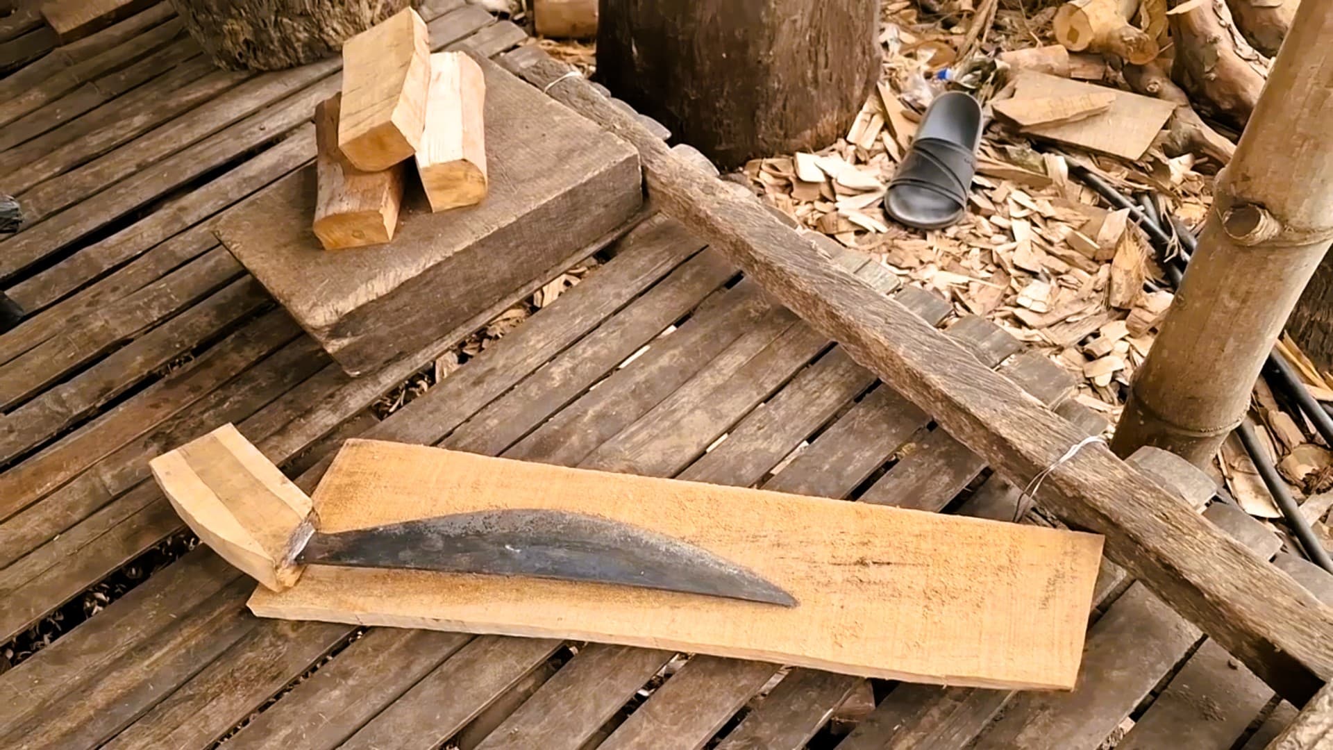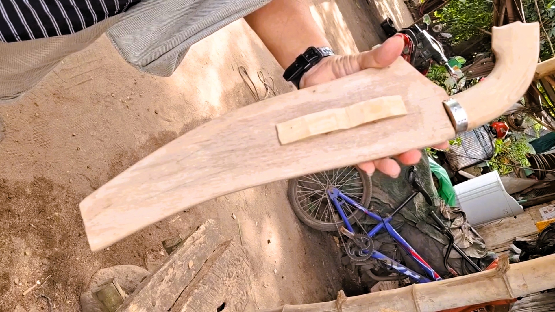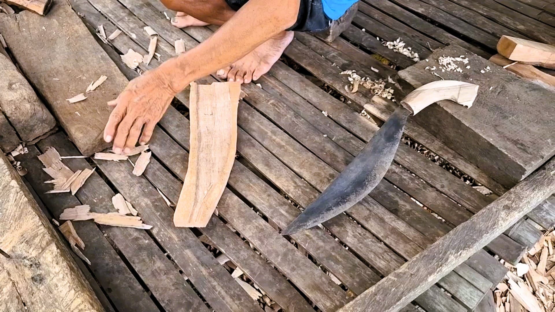 Eine Woche später ergibt sich die Gelegenheit, den nächsten Abschnitt dieses handwerklichen Prozesses zu beobachten. Die Klinge ist inzwischen fertig geschmiedet und gehärtet. Nun geht es an die Feinarbeit: Griff und Scheide werden gefertigt. Dafür wird Guavenholz verwendet – ein Material, das nicht nur lokal verfügbar, sondern auch robust und angenehm in der Hand ist. Mit einfachen Werkzeugen und viel Fingerspitzengefühl entsteht ein funktionaler und gleichzeitig ästhetischer Griff. Auch die Scheide wird passgenau gefertigt, sodass das Bolo sicher transportiert werden kann.