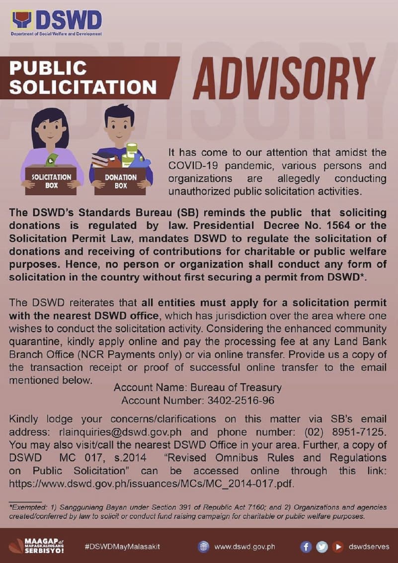 ja, ist tatsächlich so dass ein NGO eine Genehmigung braucht um eine Solicitation oder Fundraising Events zu ermöglichen. Ich folge die FB-Seite von DSWD und bekomme dort auch einiges über SWDA’s, so nennen sie die NGOs.