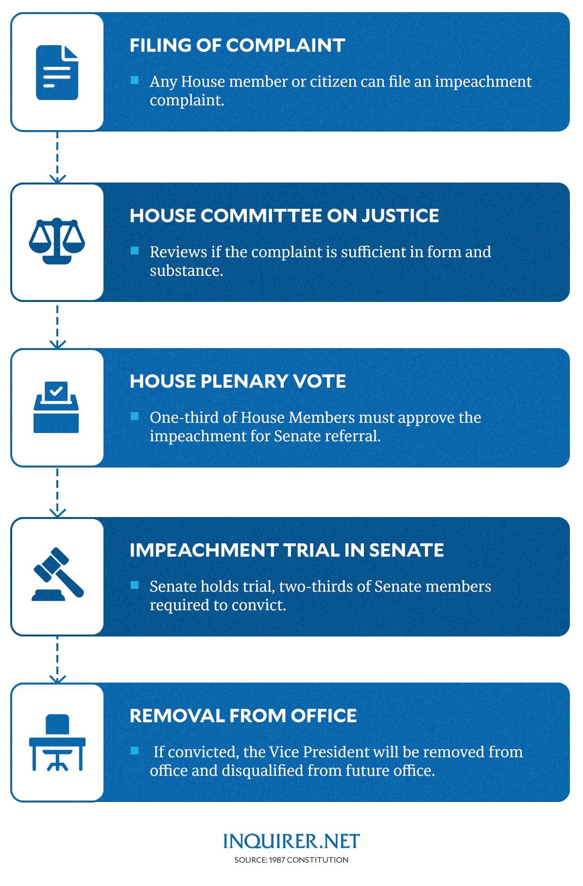Das Amtsenthebungsverfahren für einen Vizepräsidenten, wie es in Abschnitt 3, Artikel XI der Verfassung von 1987 beschrieben ist, folgt einer Reihe von Schritten. Diese Schritte beginnen mit der Einreichung einer verifizierten Klage und enden mit einer Verhandlung im Senat.