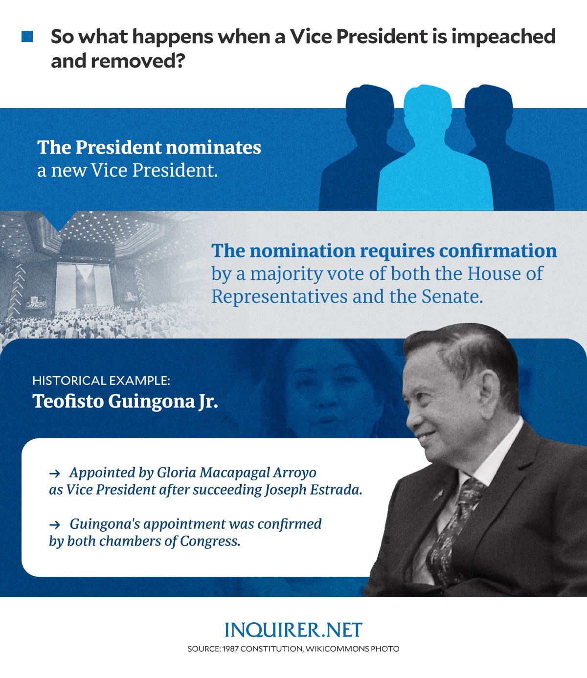 Wenn der Vizepräsident angeklagt und seines Amtes enthoben wird, kommt Abschnitt 9 von Artikel VII der Verfassung ins Spiel. Dieser Abschnitt ermächtigt den Präsidenten, einen neuen Vizepräsidenten zu ernennen, der dann sowohl vom Repräsentantenhaus als auch vom Senat bestätigt werden muss.