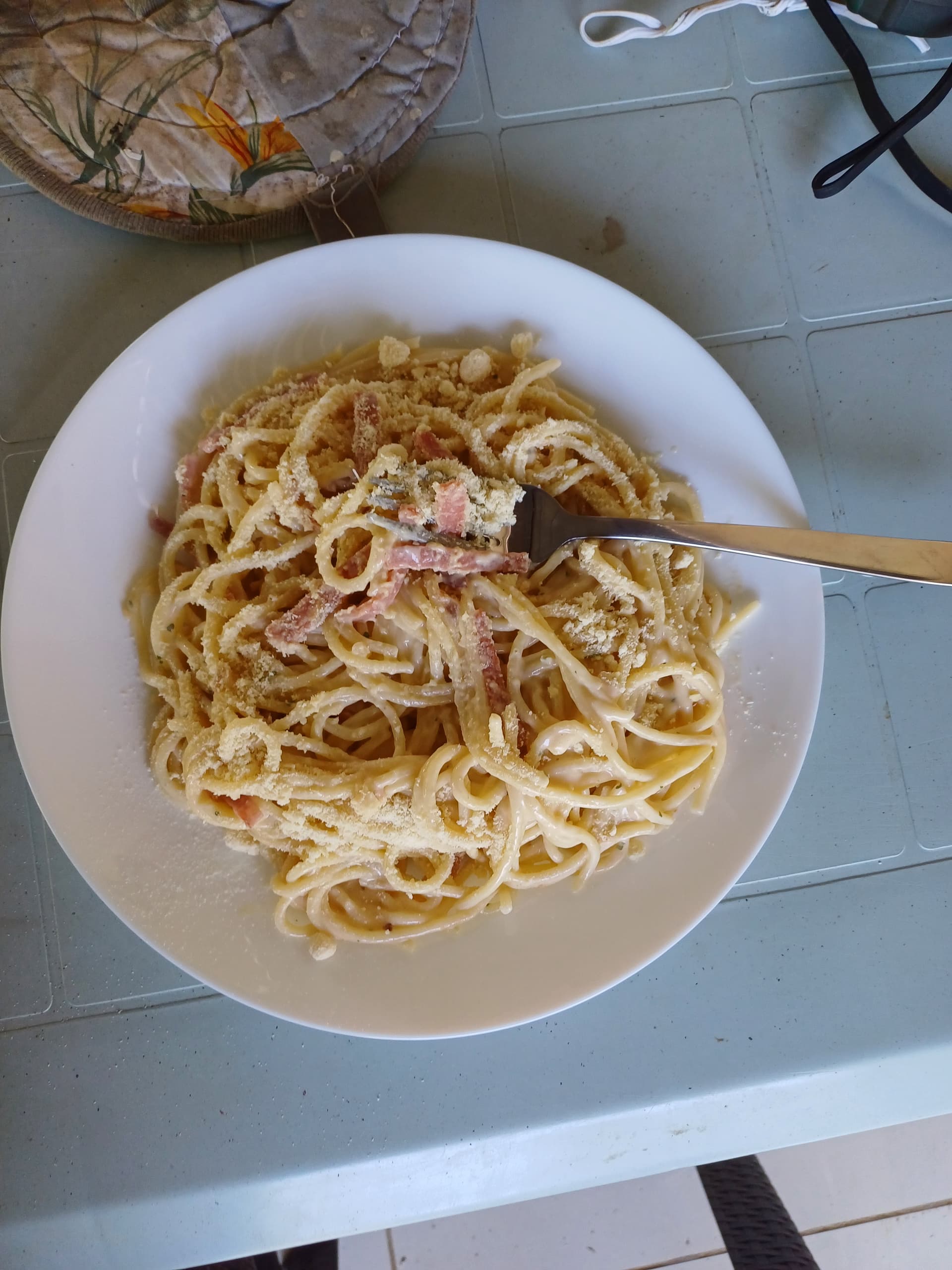 Hoffentlich richtig und nicht wie es die Philippiner meinen es wäre richtig (mit Sahne). Carbonara gehört mit gestocktem Ei und Pecorino bzw notfalls Parmesan