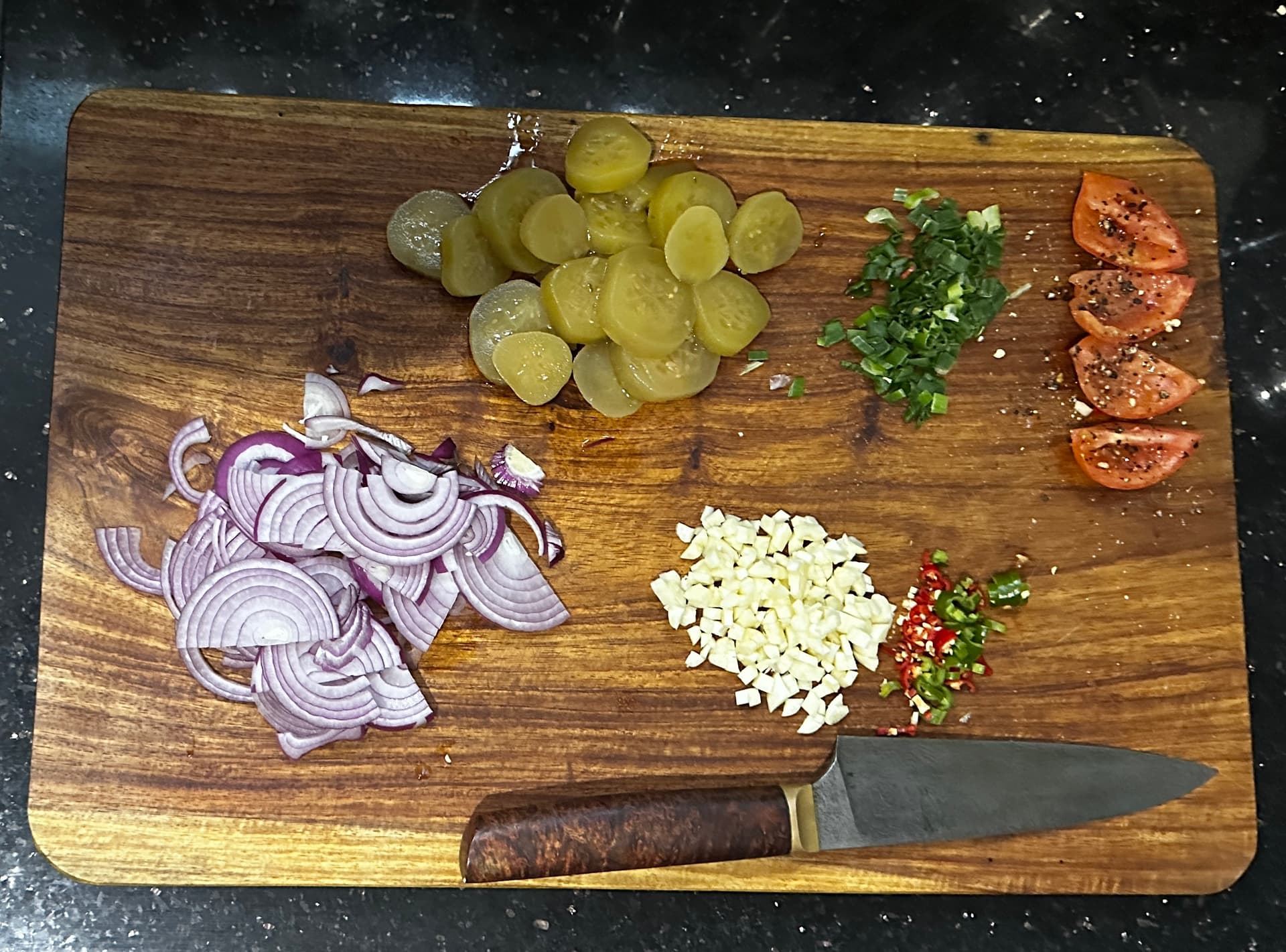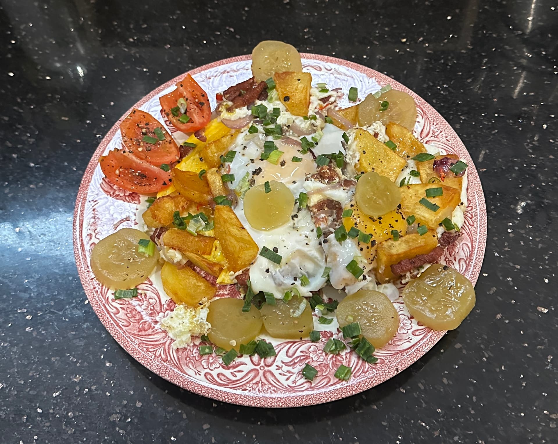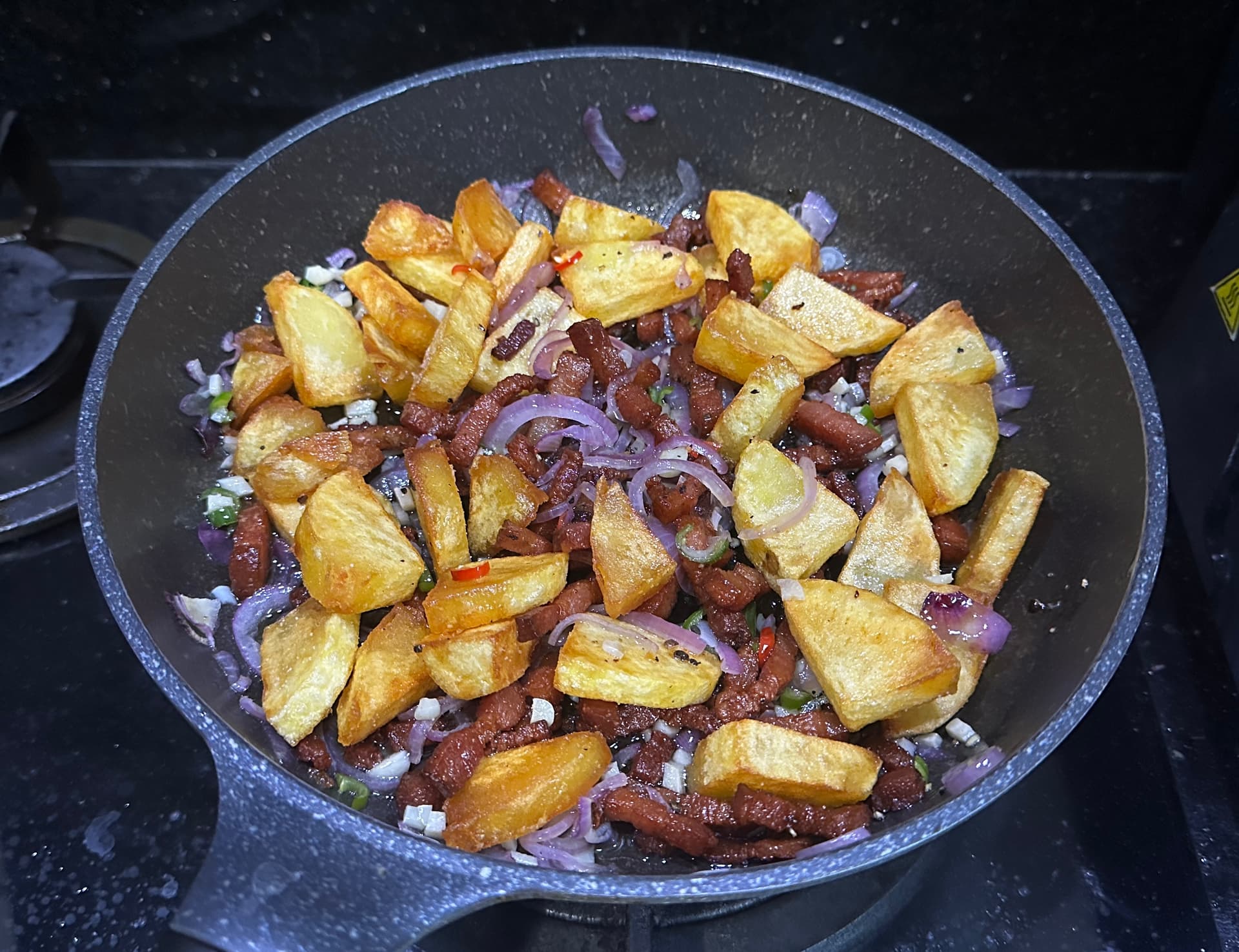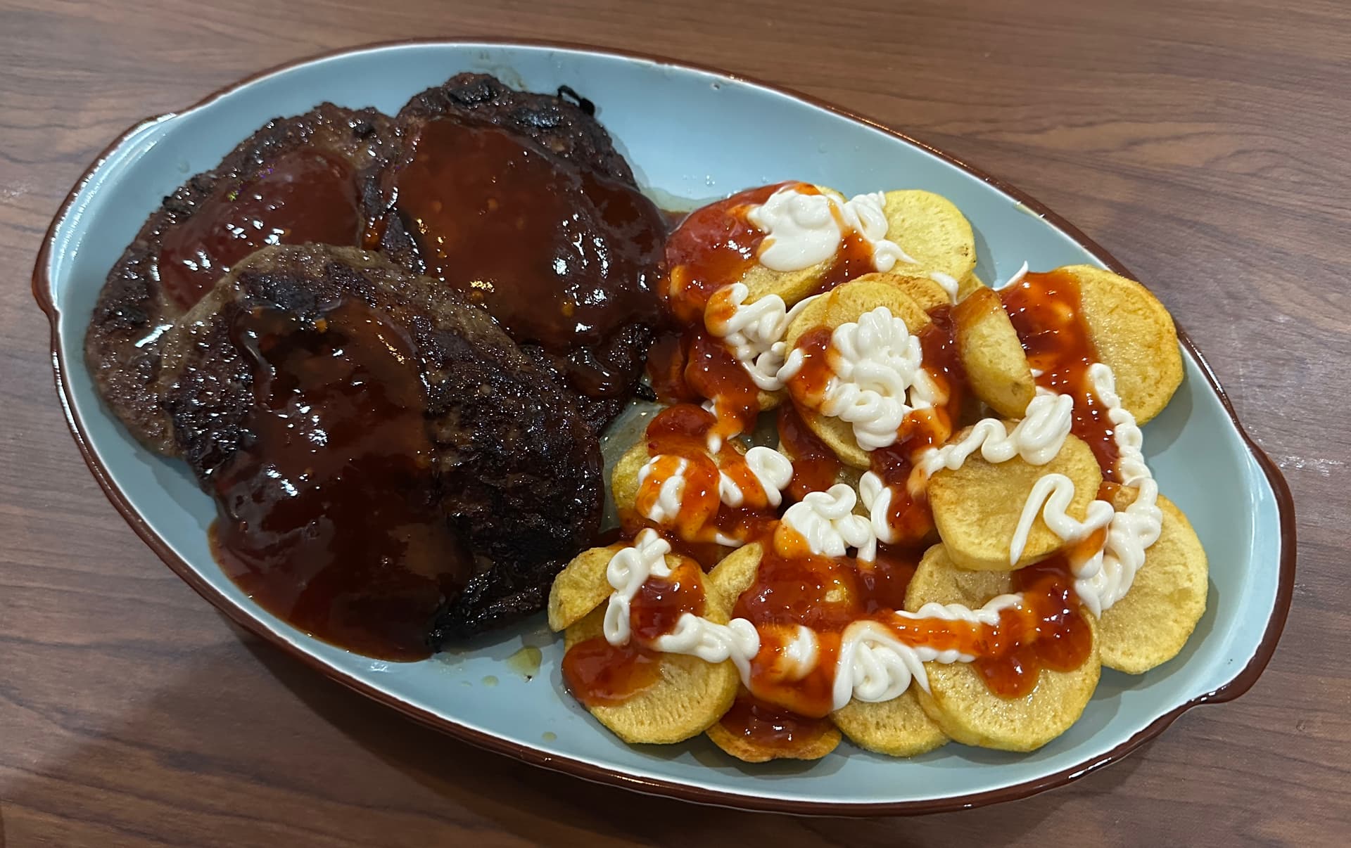Da die Gattin mit Erkältung zu Bette liegt (Pinoys können mit ihrem Gehabe jede Männergrippe übertrumpfen…), musste der Hausherr ran… hatte aber keinen Bock auf langes Kochen und daher kamen Hacksteaks aus der Truhe in die Pfanne und ein paar der immer im Kühlschrank vorrätigen gekochten Kartoffeln in die Fritteuse…