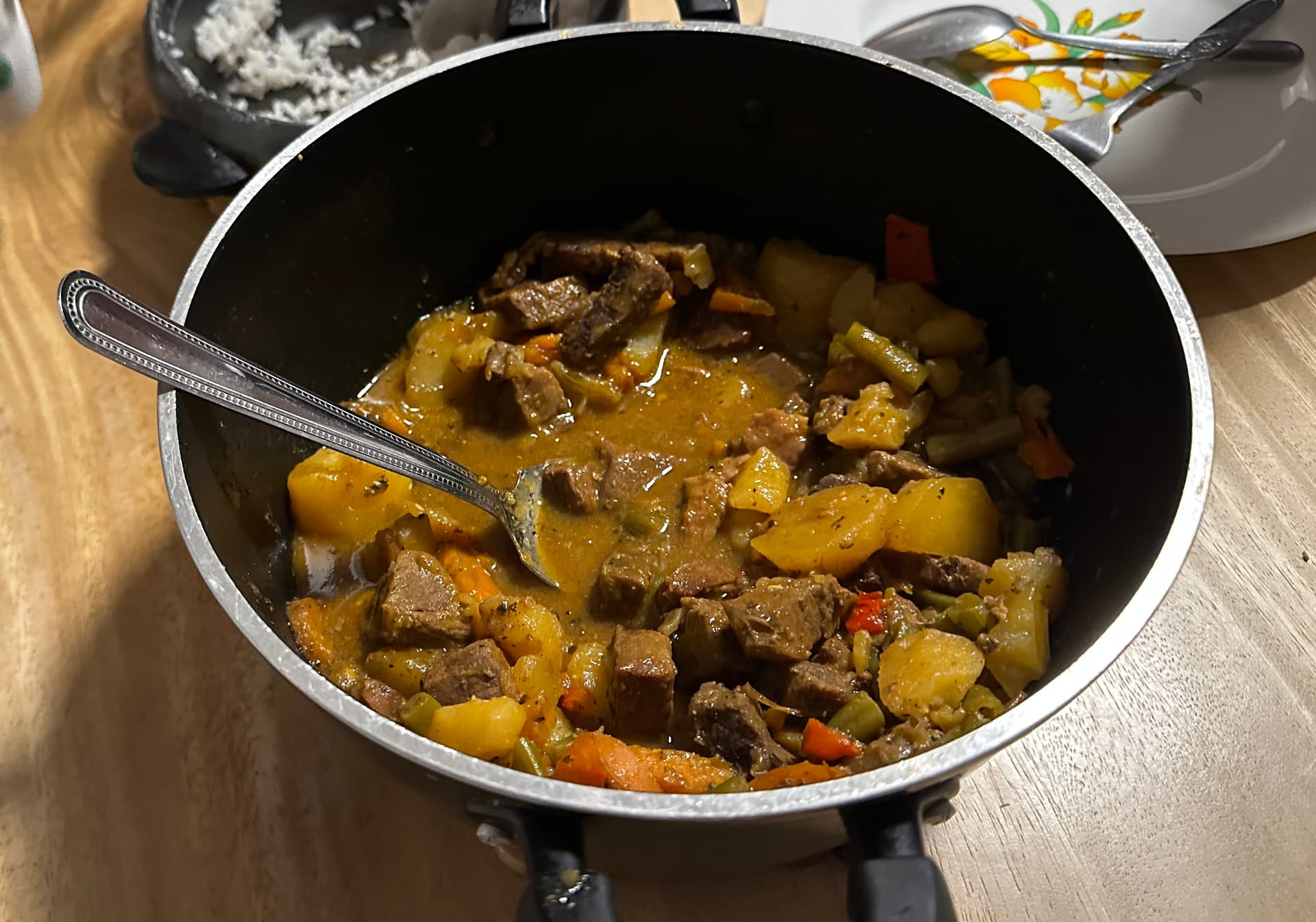 Ich war gestern bei den Nachbarn… es gab Beef Caldereta (also Gulasch), leider nicht in der ursprünglichen Version mit Ziegenfleisch…
