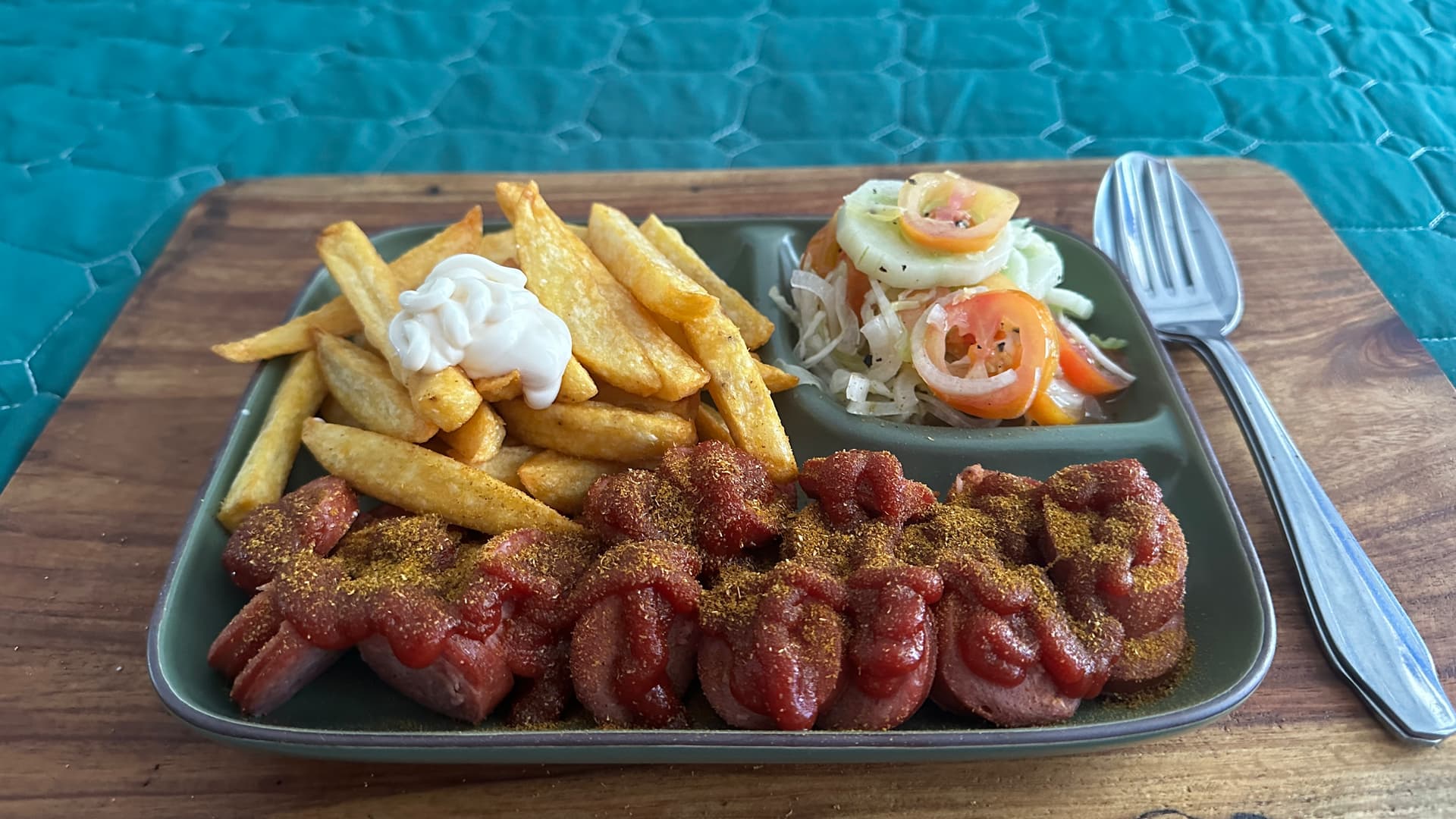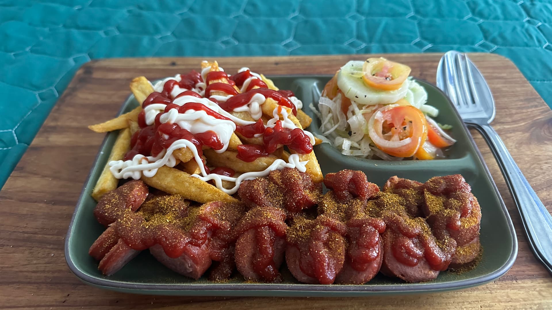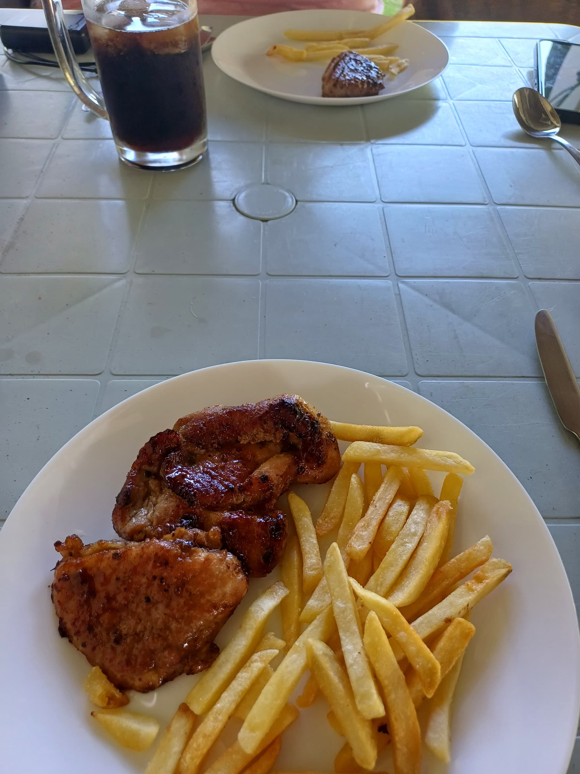 Und… noch viel mehr leider, hatten sich hier philippinische „Kochkünste“ auf englischem Niveau präsentiert… lebt doch die Köchin seit vielen Jahren als Krankenschwester auf der Insel. Ich hatte mich daher weitgehend an Kartoffeln, Gemüse und Soße sattgegessen und die steinharten Fleisch/Leberklumpen den anderen überlassen…