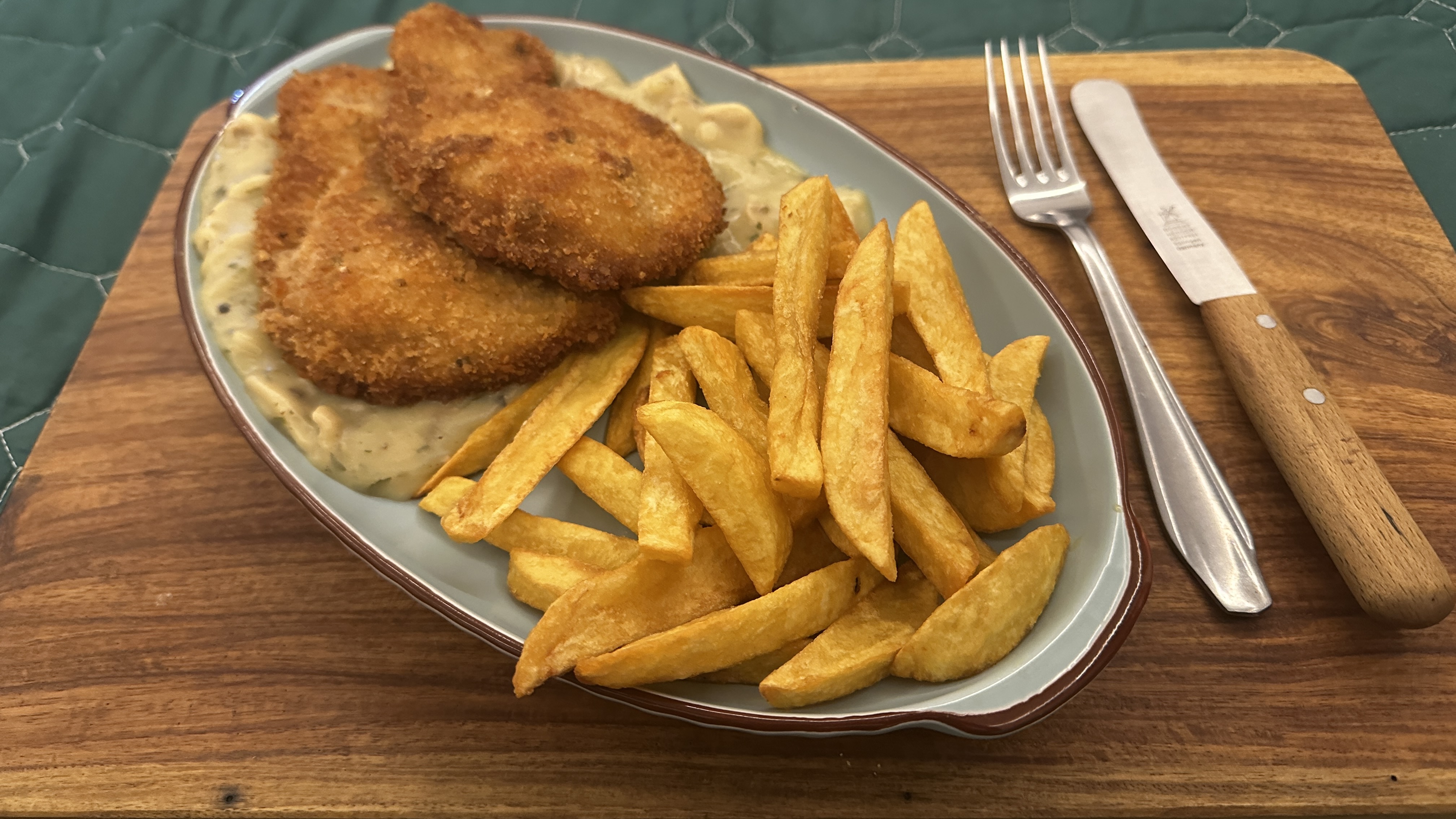 von der Gattin in der von ihr kreierten Panade frittiert und mit gemischtem Salat serviert…