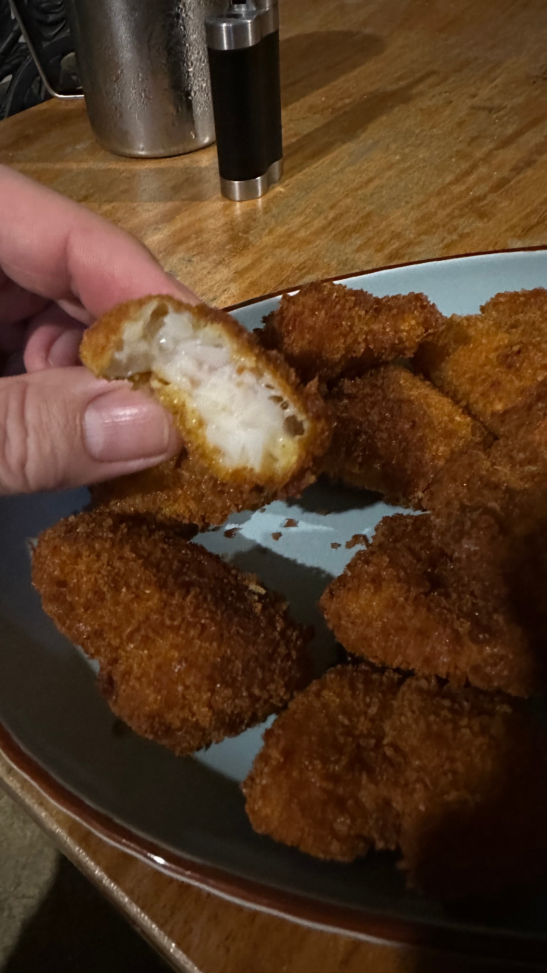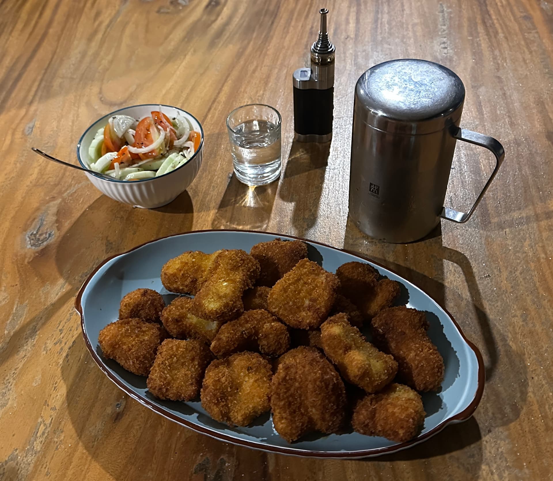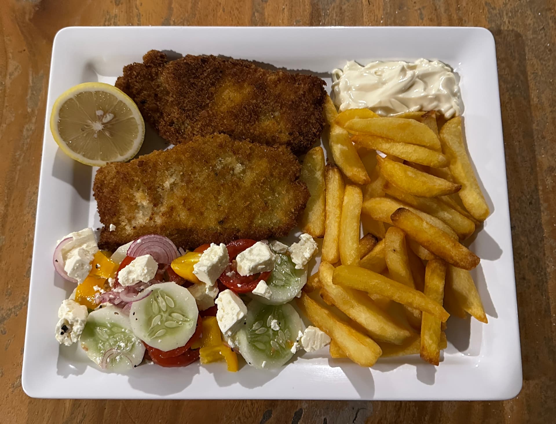 Hier gab es wieder Fischfilet, von der Gattin in mundgerechten saftigen Stücken in eigener Panade frittiert und etwas gemischtem Salat mit Honig-Vinaigrette serviert…