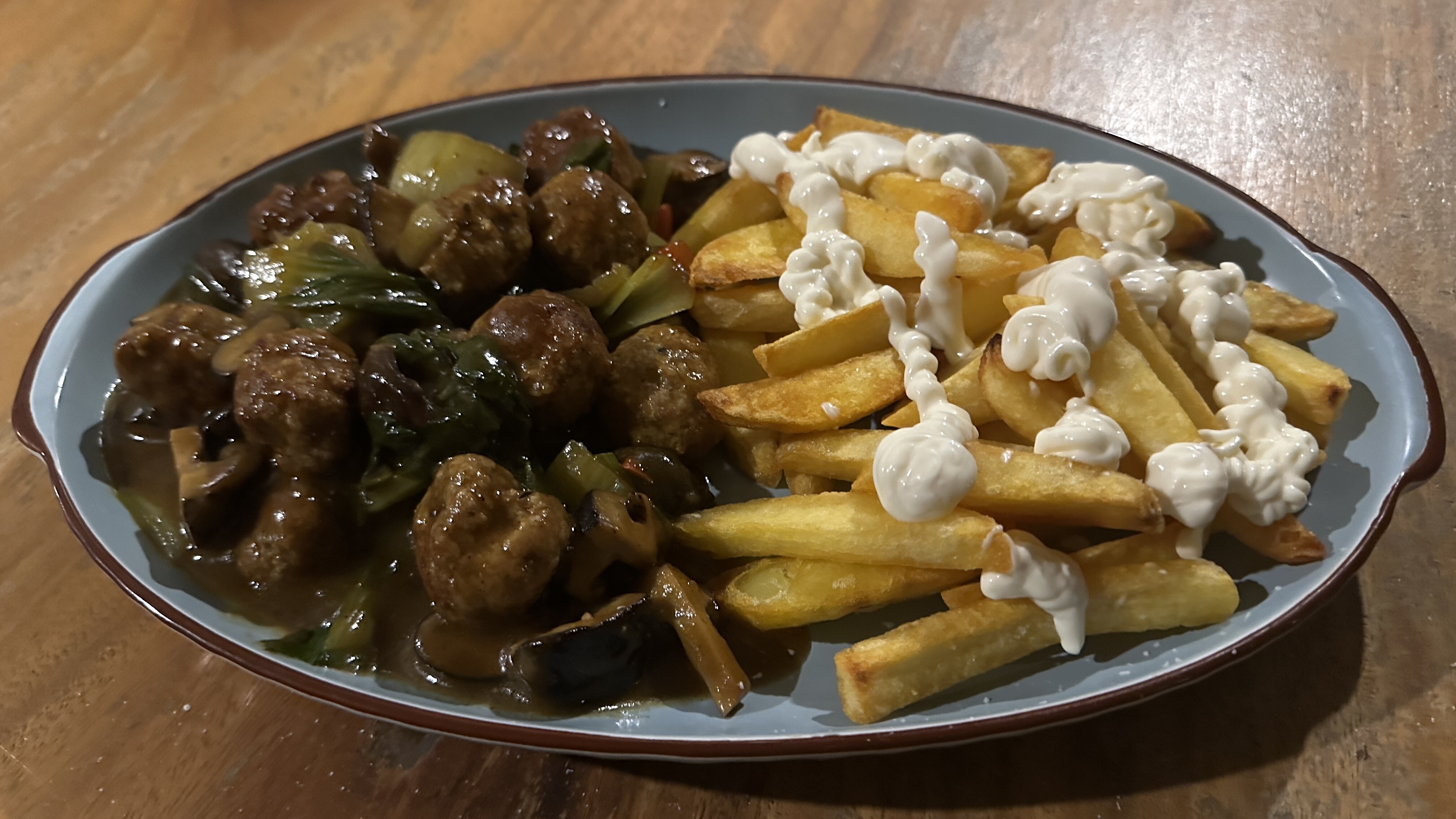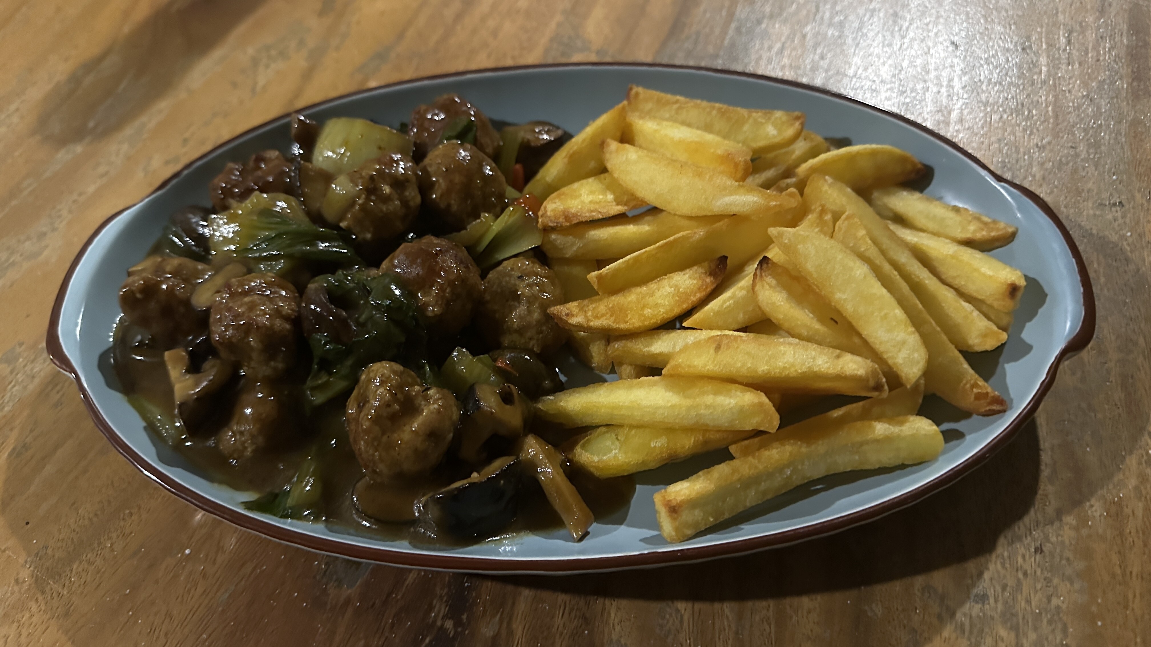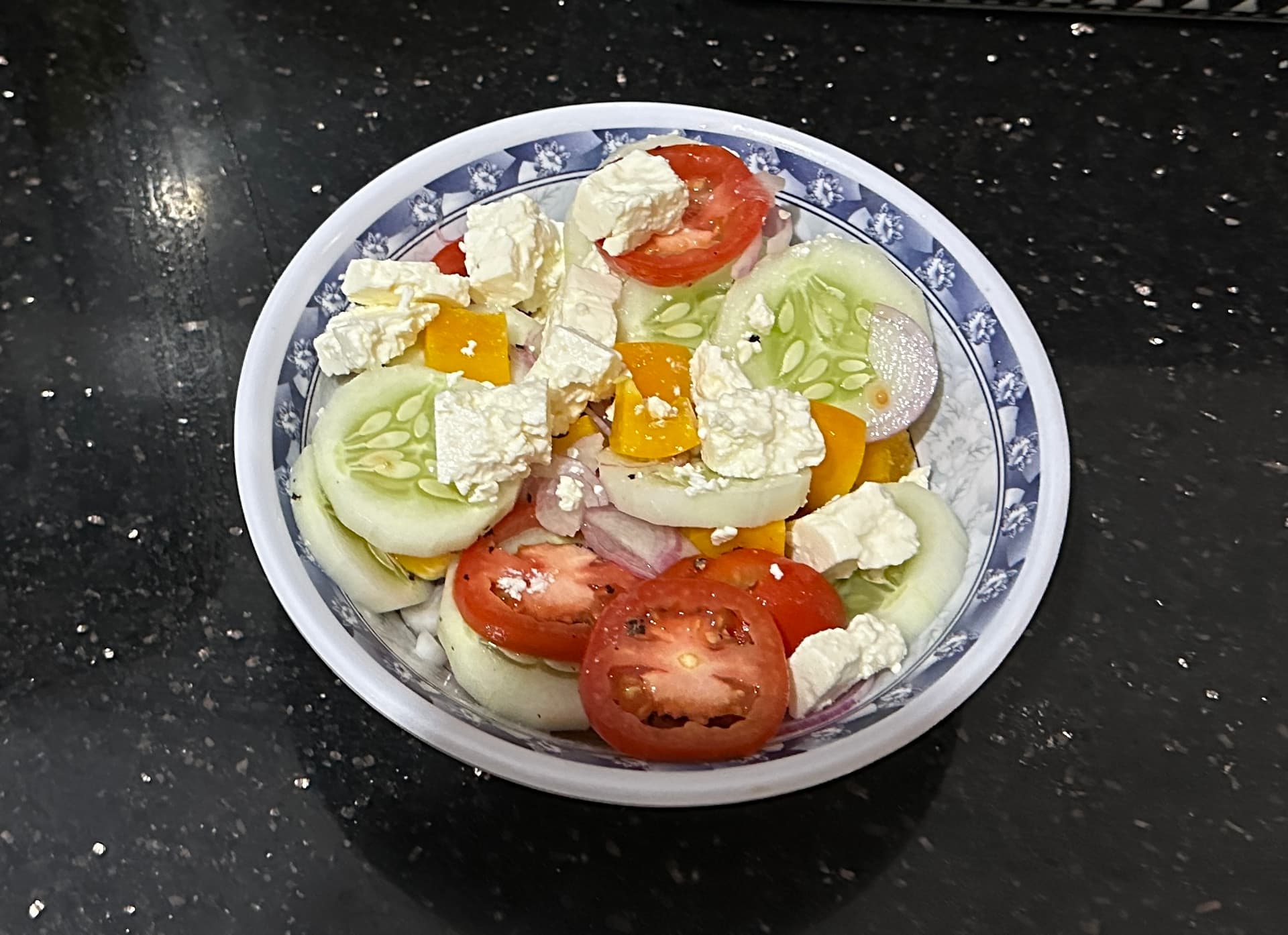 Hier gab es wieder Fischfilet, von der Gattin in mundgerechten saftigen Stücken in eigener Panade frittiert und etwas gemischtem Salat mit Honig-Vinaigrette serviert…