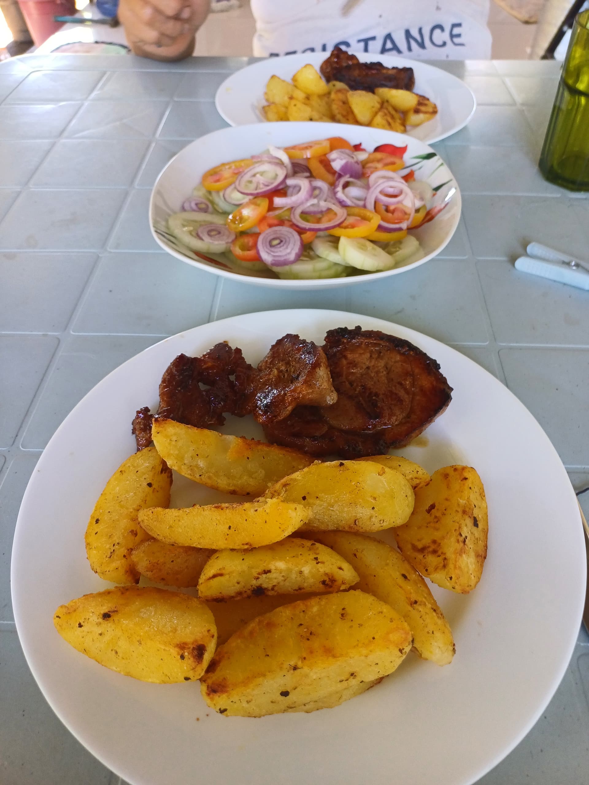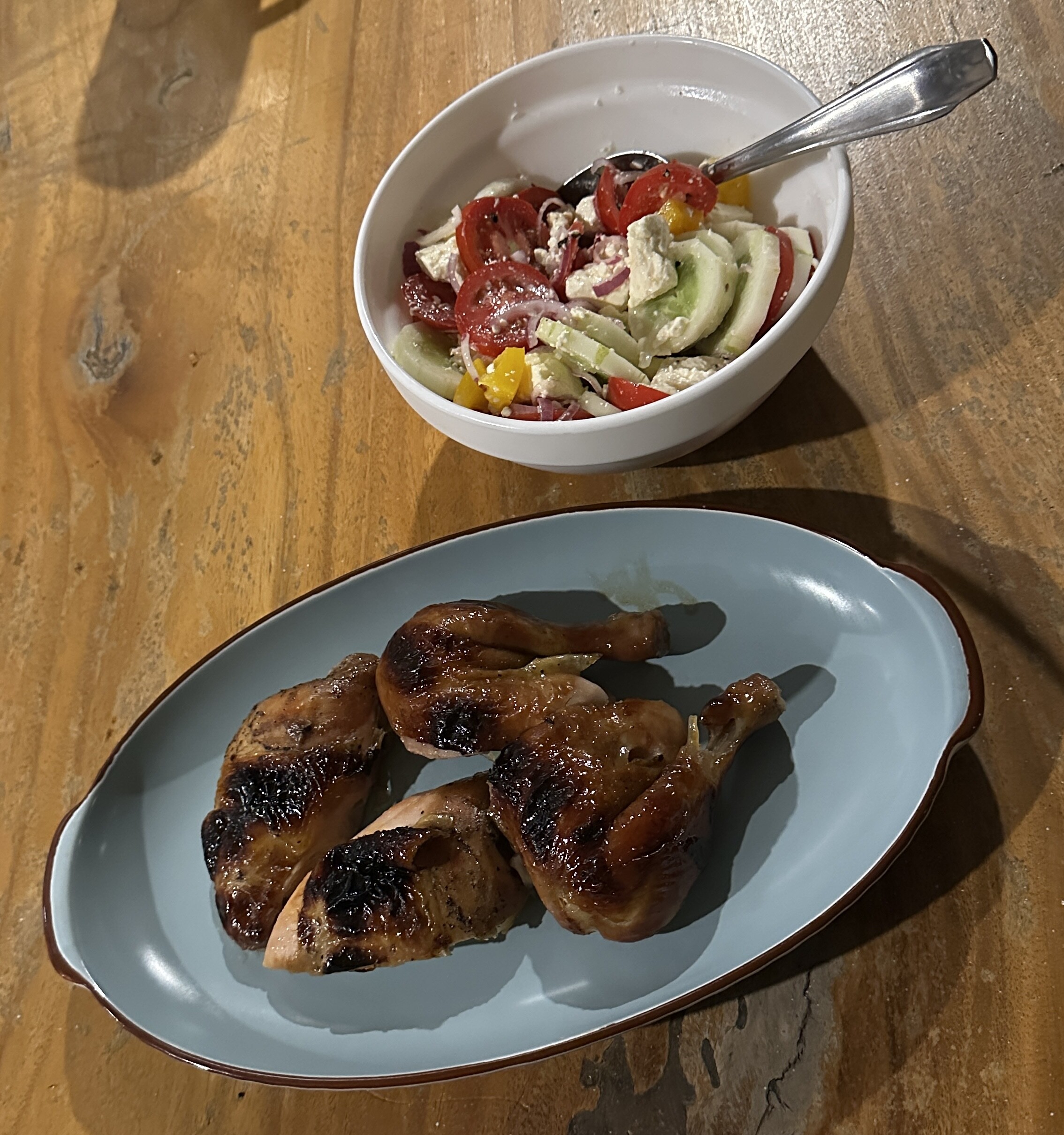 wollte die Gattin in Sta. Catalina noch Reis kaufen… Beim Warten am Markt hatte ich bemerkt, daß der Hähnchenbrater gerade mit einer frischen Rutsche fertig war, und so gab es heute Abend Grillhähnchen mit Salat…