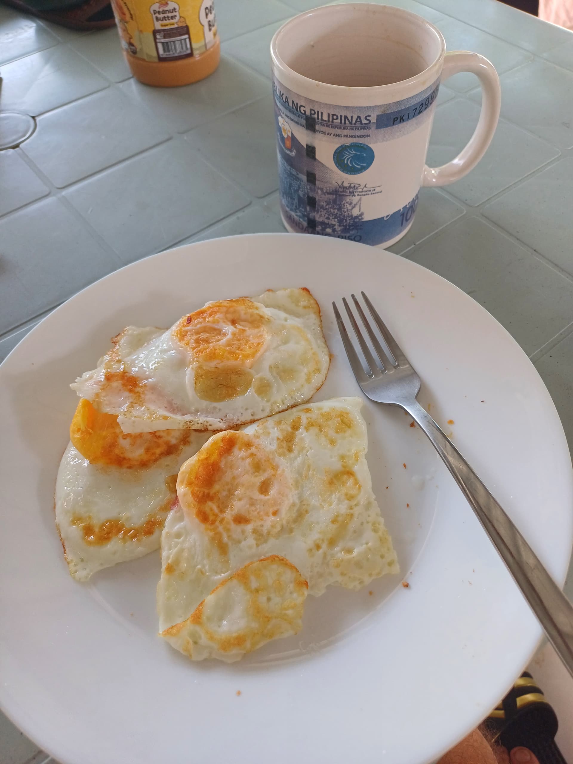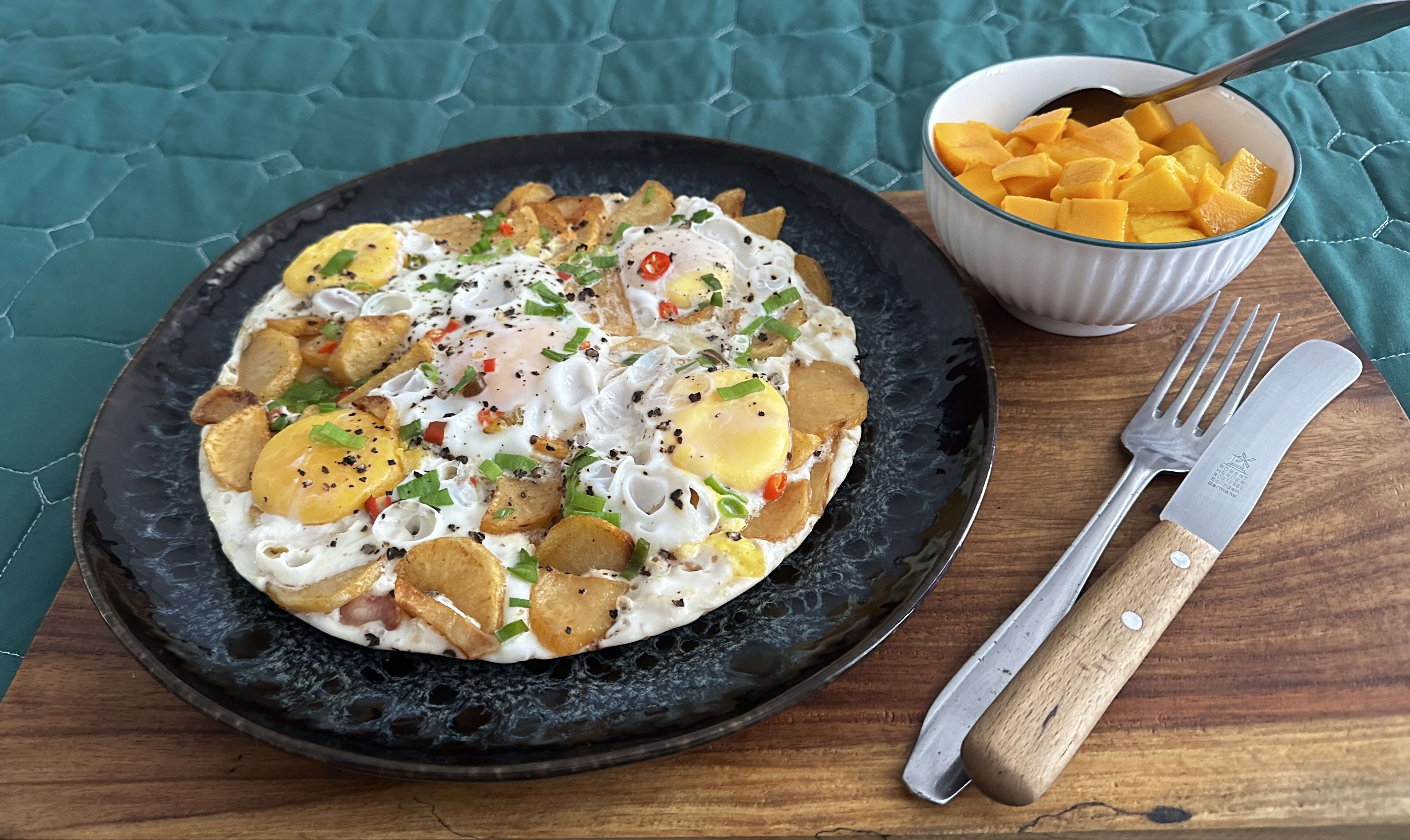 Das erste mal gekaufte Eier, weil wir inzwischen alle Hühner aus dem Garten geschlachtet haben.