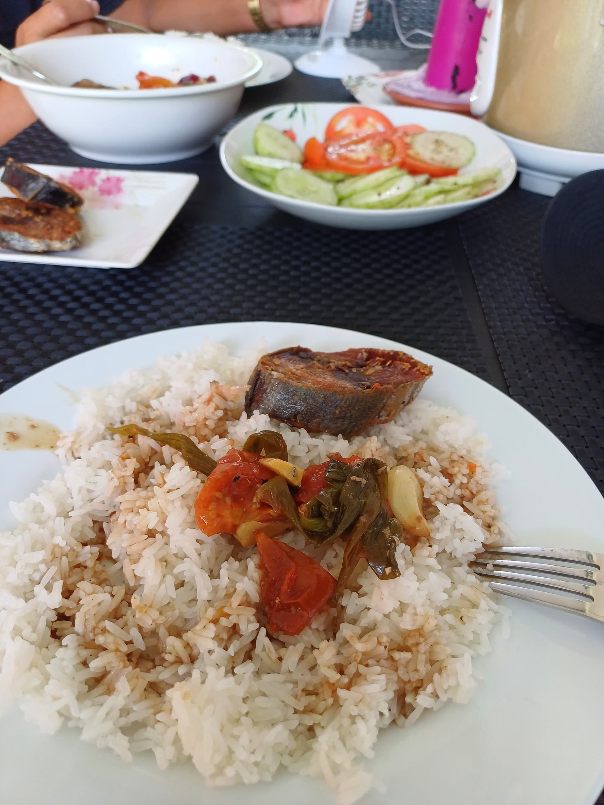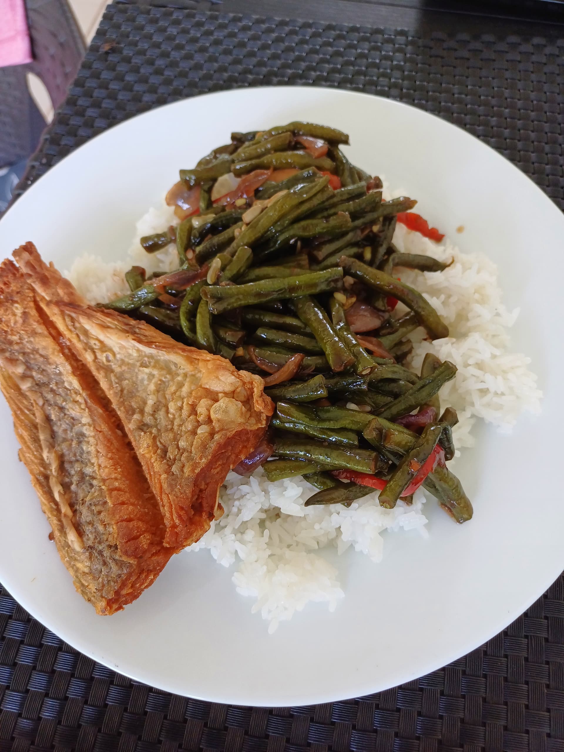 Stinkefisch mit weissem Reis und Stangenbohnen, die ich sehr gerne esse.