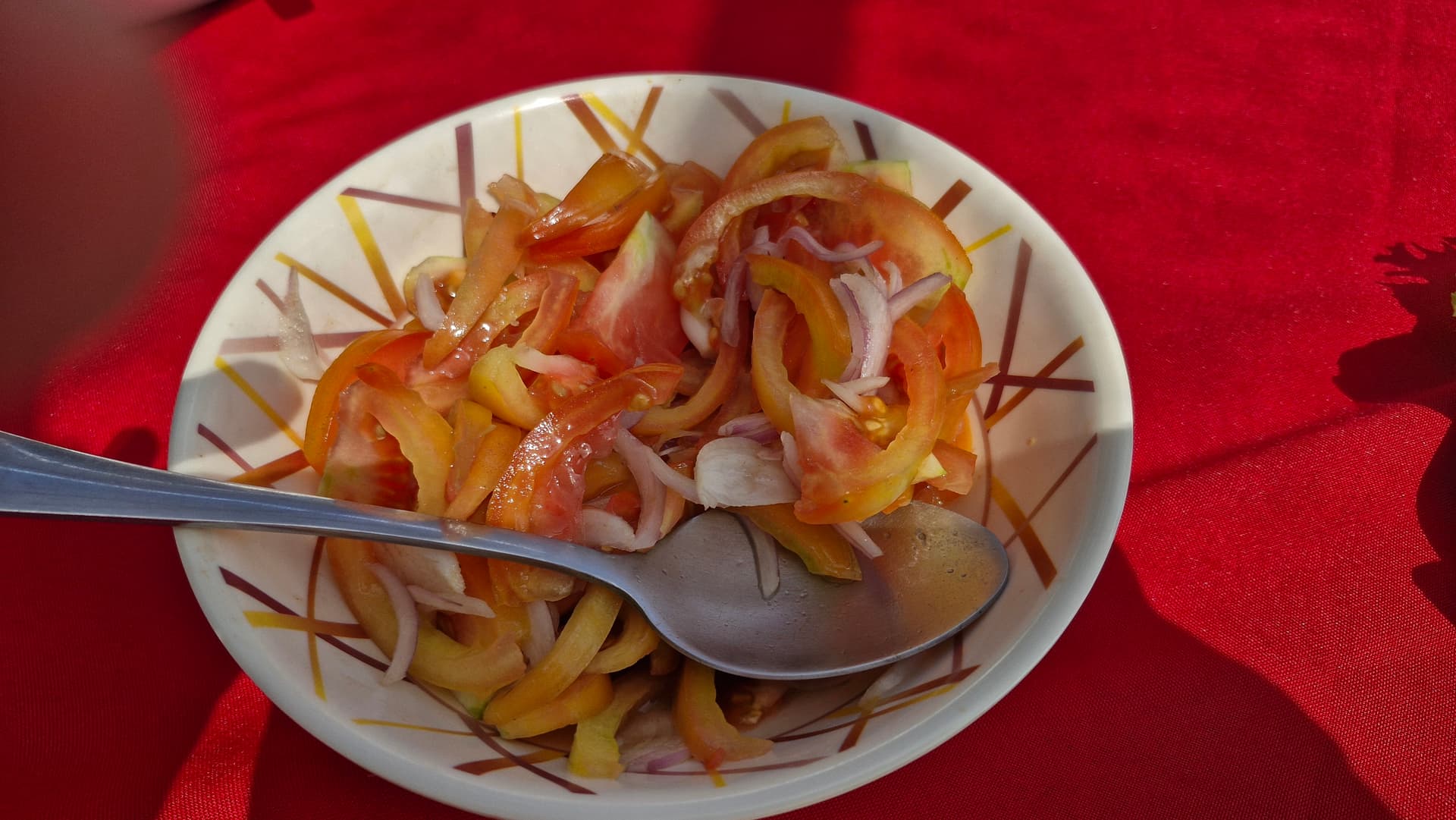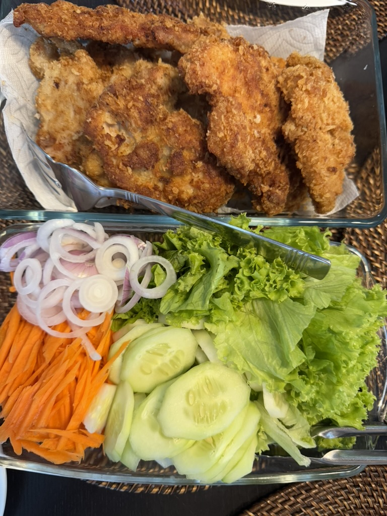 (Schweine-)Schnitzel mit Salat. Ich sag euch, so gut wie unsere Helferin bekommen sie das nicht mal bei Brotzeit hin, und die wollen Geld dafür. Knusprige Panade und innen noch saftig und zart.