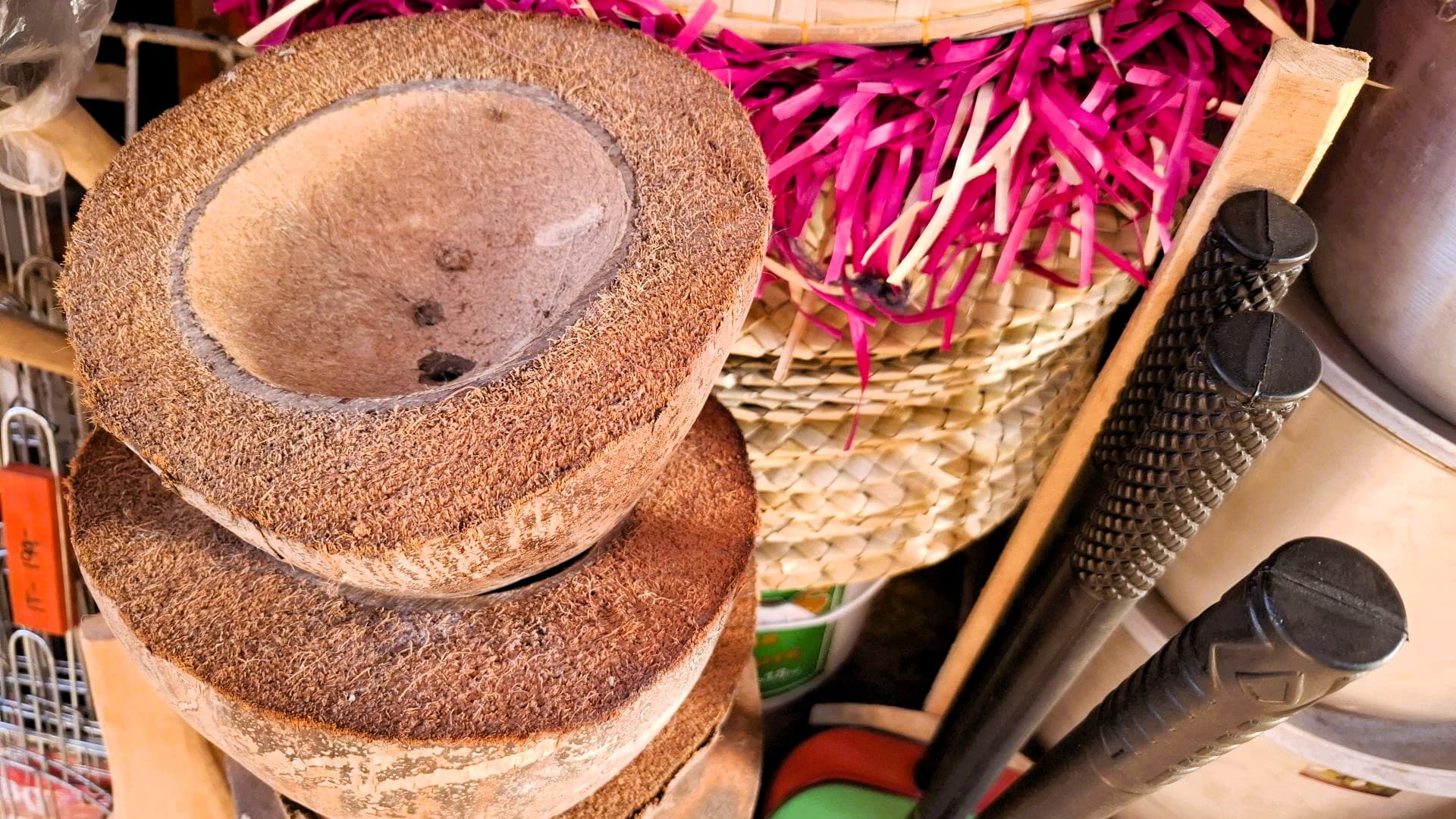 Genau so ein Moment war es, als ich dieses merkwürdige Objekt entdeckte: eine halbe Kokosnuss, die Innenseite nach oben gedreht, mit einer Art borstiger Struktur. Kein Griff, kein Stiel, kein modernes Design. Einfach nur ein Stück Natur, offensichtlich zweckentfremdet – oder besser gesagt: genial genutzt.